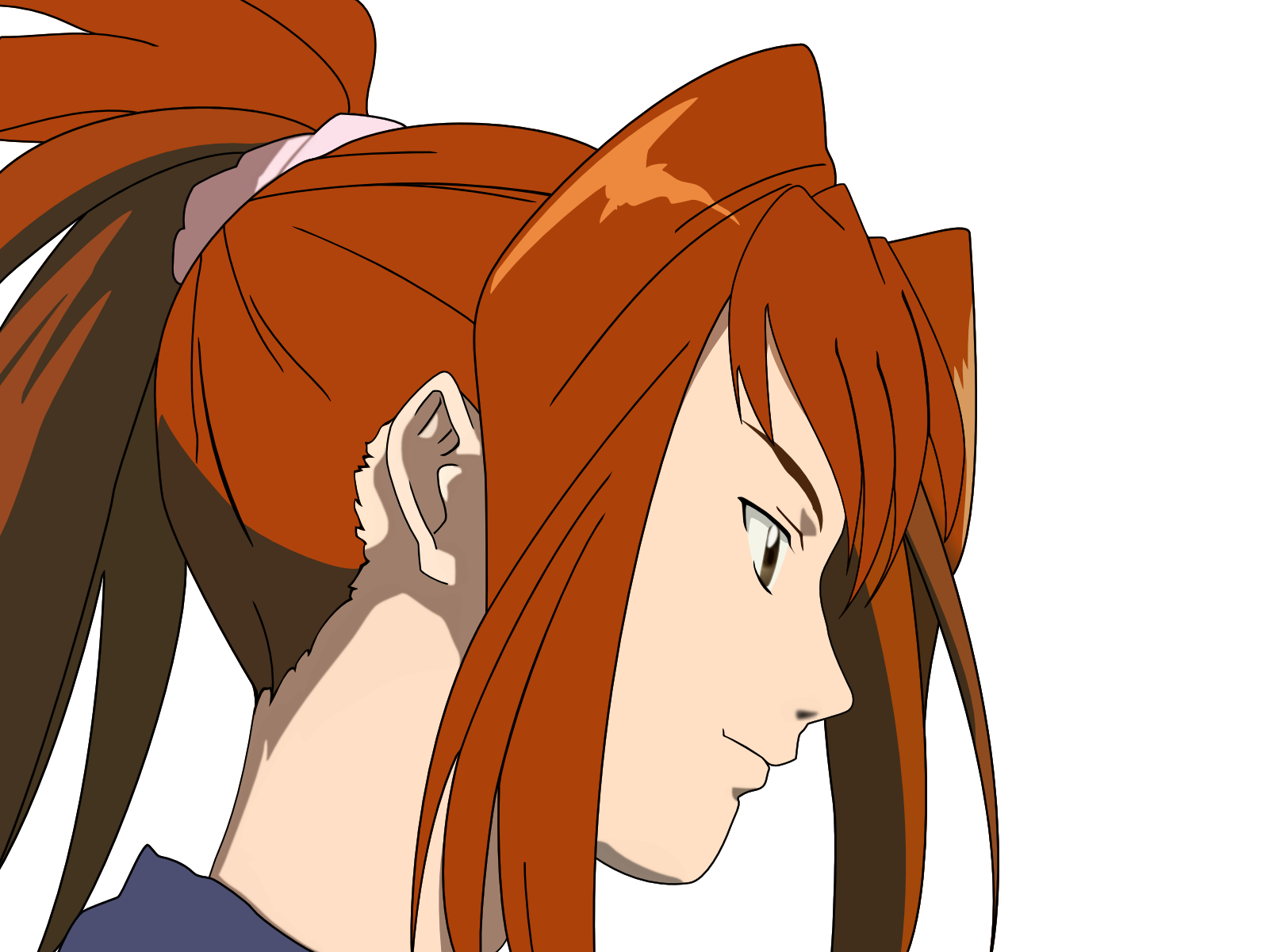 Description: A woman with red hair with a ponytail in her hair looking down at something in her hand and a white background.