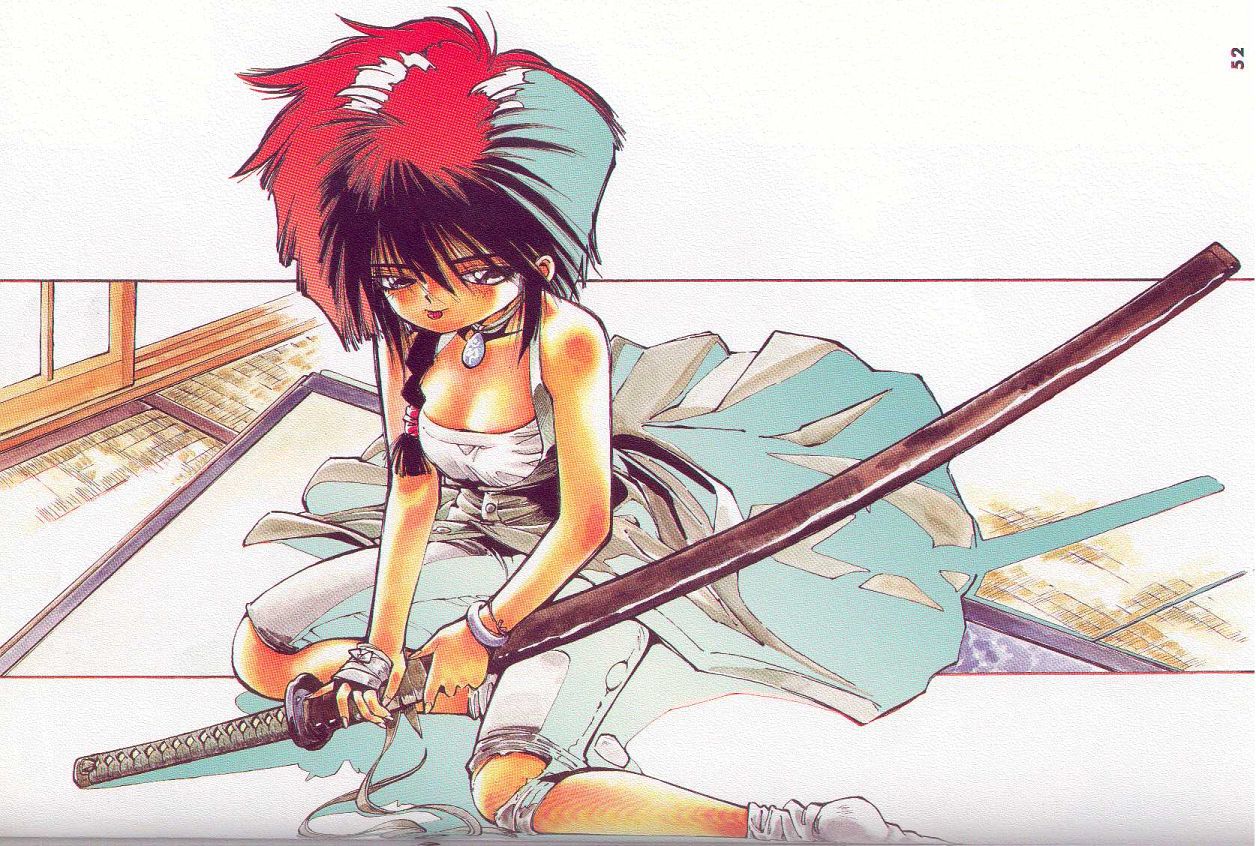 Description: A woman with a sword kneeling down on the ground with a red hair and a blue dress on her body.