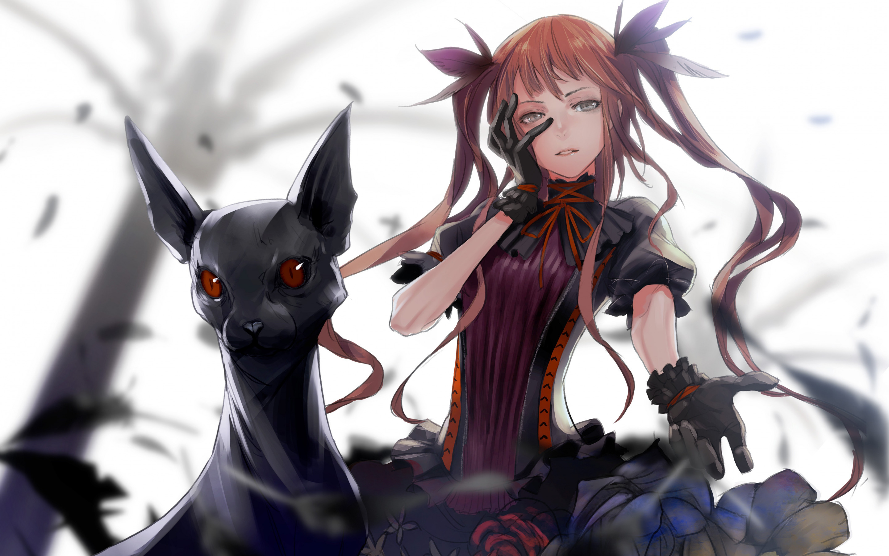 Description: A woman with red hair and a black cat in front of her is standing next to a black cat.