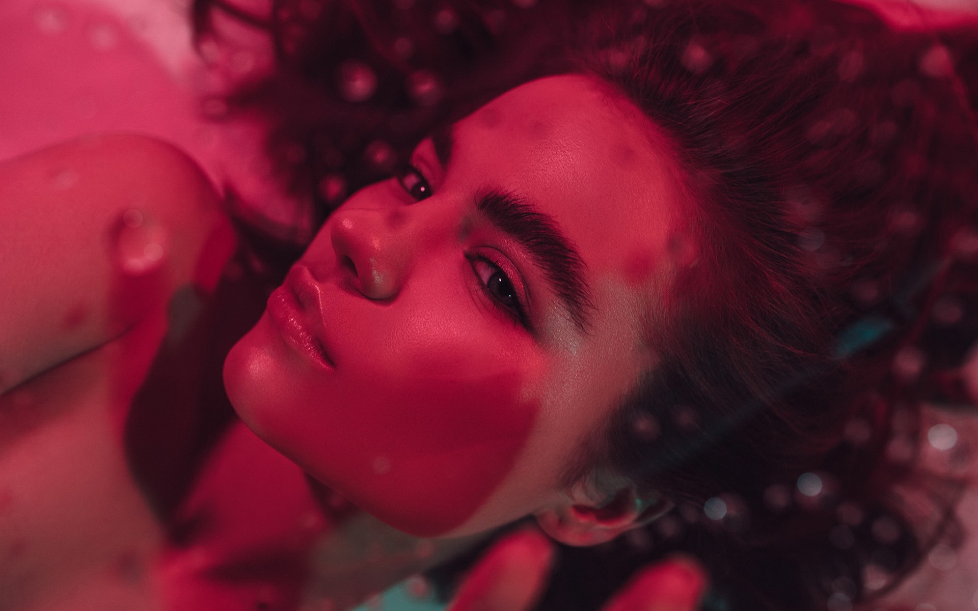 Description: A woman with red hair laying on a bed with bubbles on her face and body and a pink background.