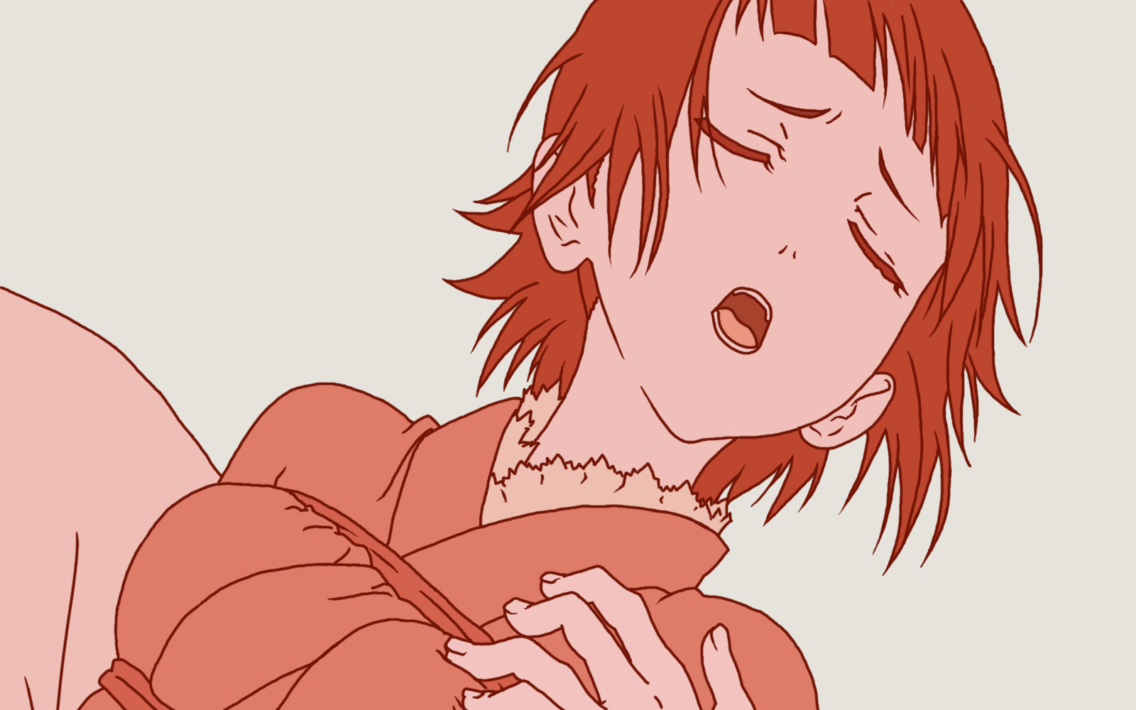Description: A woman with red hair and a red shirt is holding a cell phone in her hand and looking at the camera.
