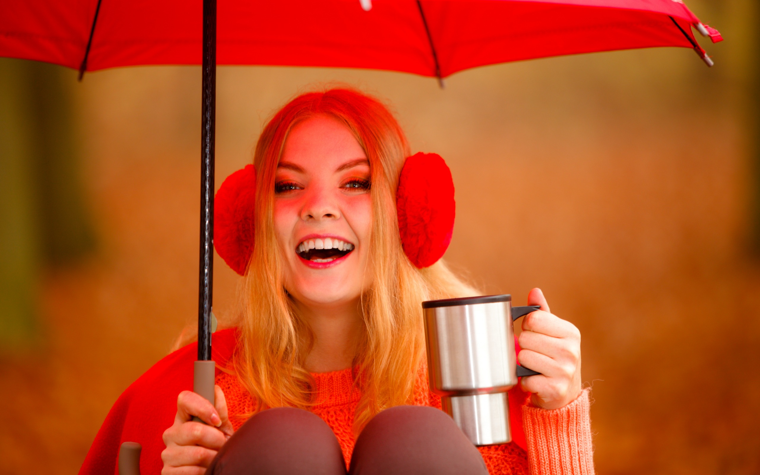 Description: A woman with red hair holding a red umbrella and a cup of coffee in her hands and smiling at the camera.