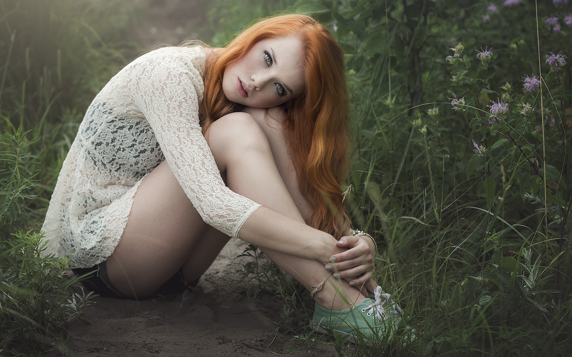 Description: A woman with red hair is sitting in a field of grass and flowers.