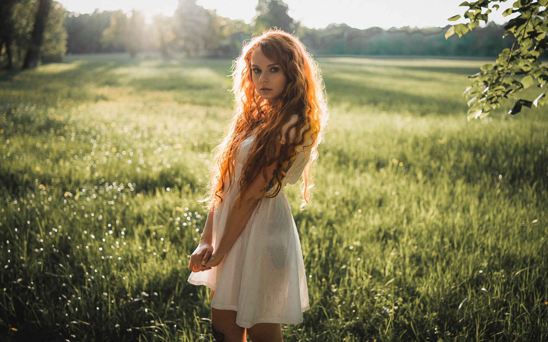 Description: A woman with long red hair standing in a field of grass with her hands in her pockets and looking at the camera.