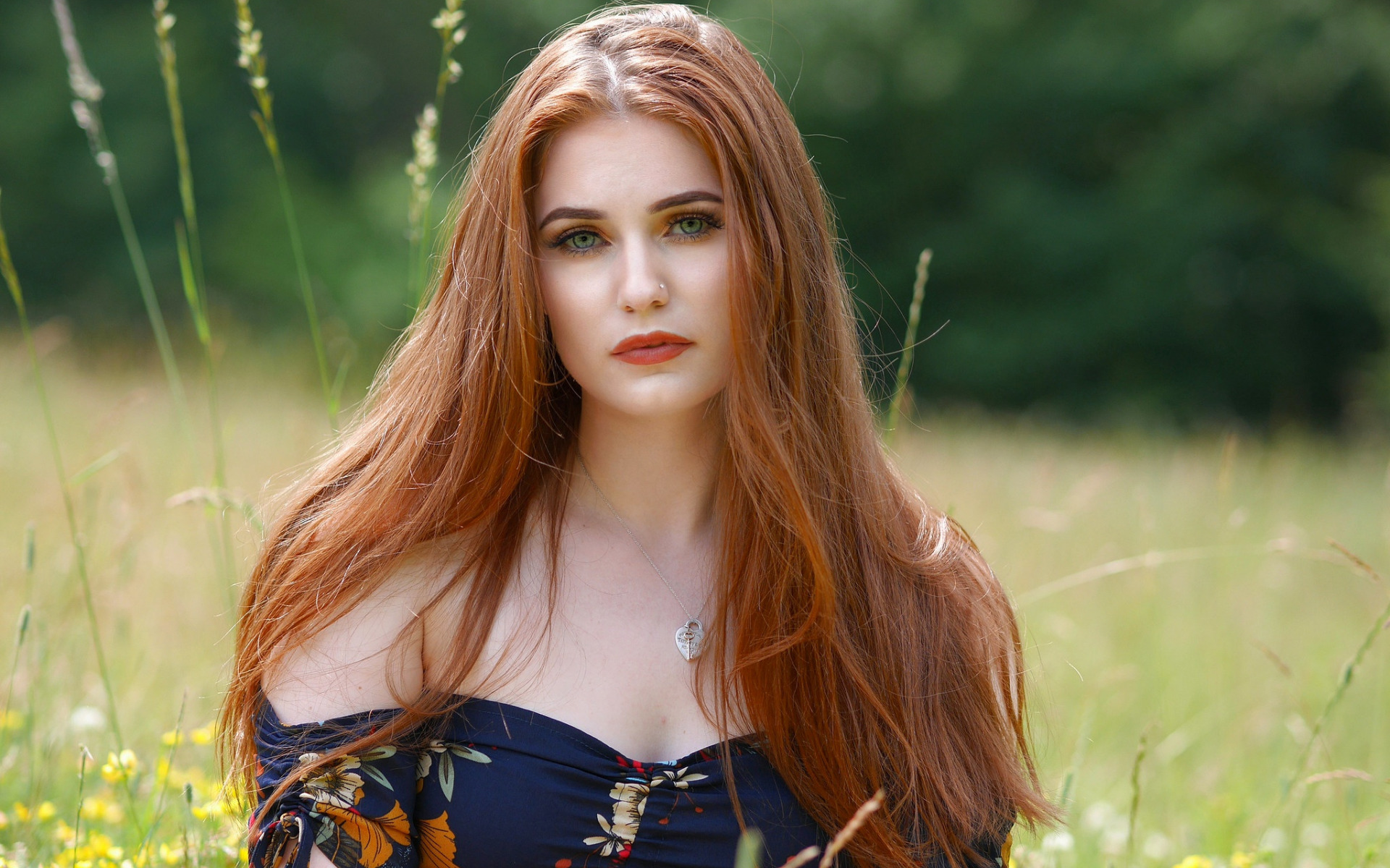 Description: A woman with long red hair standing in a field of flowers and grass with her eyes closed and her hair blowing in the wind.