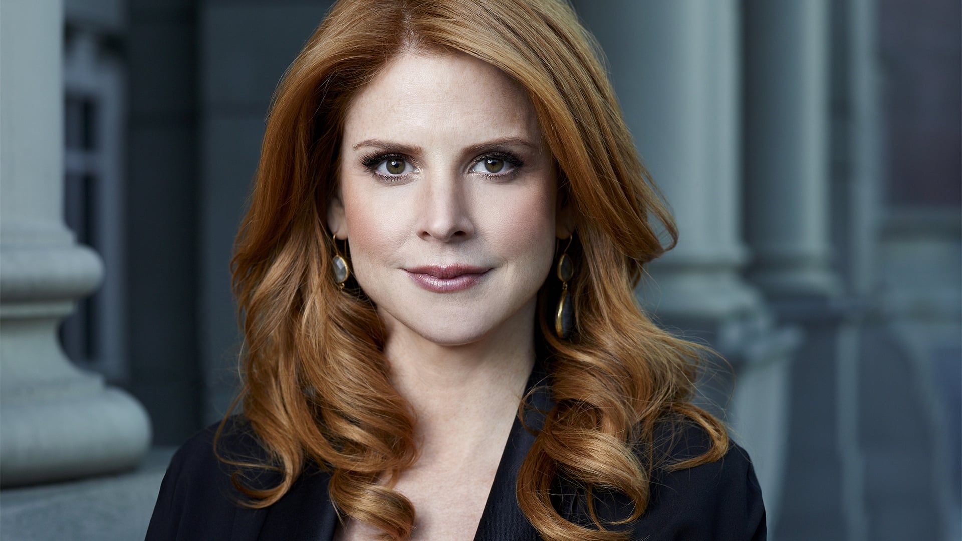 Description: A woman with long red hair and a black shirt is posing for a picture with her eyes closed and a serious look on her face.