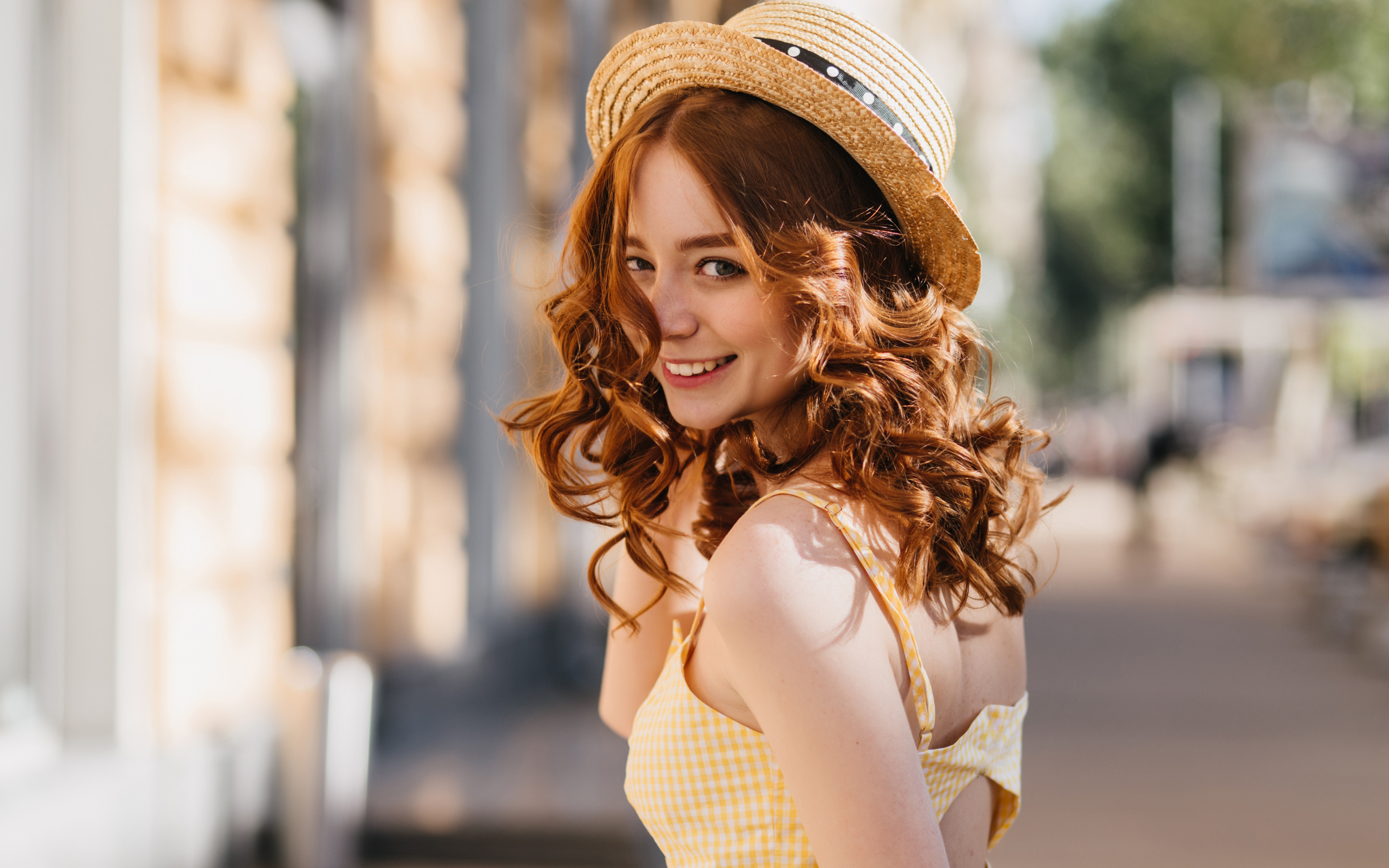 Description: A woman with red hair wearing a straw hat and yellow dress and smiling at the camera with a building in the background.