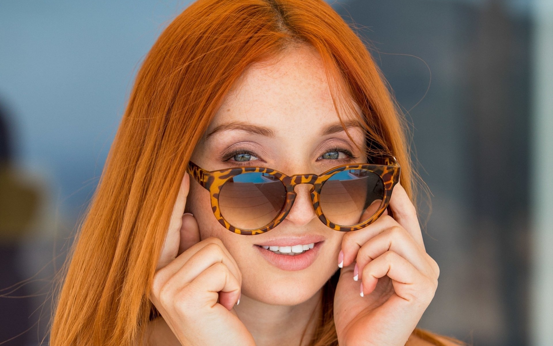 Description: A woman with red hair and sunglasses posing for a picture with her hands on her face and her eyes closed.