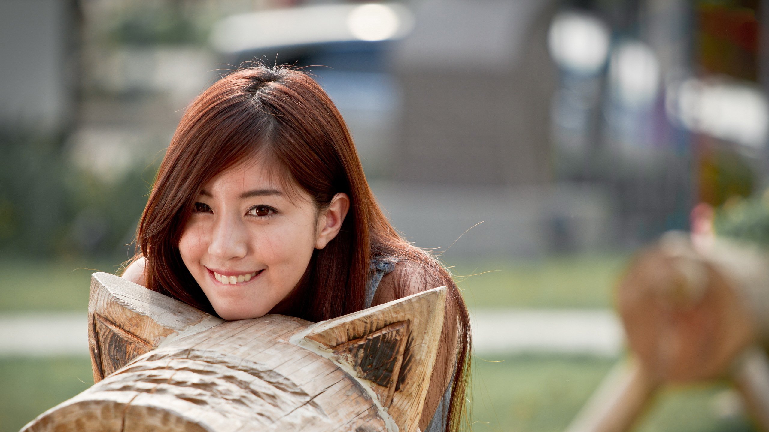 Description: A woman with red hair and a wooden animal statue in front of her.