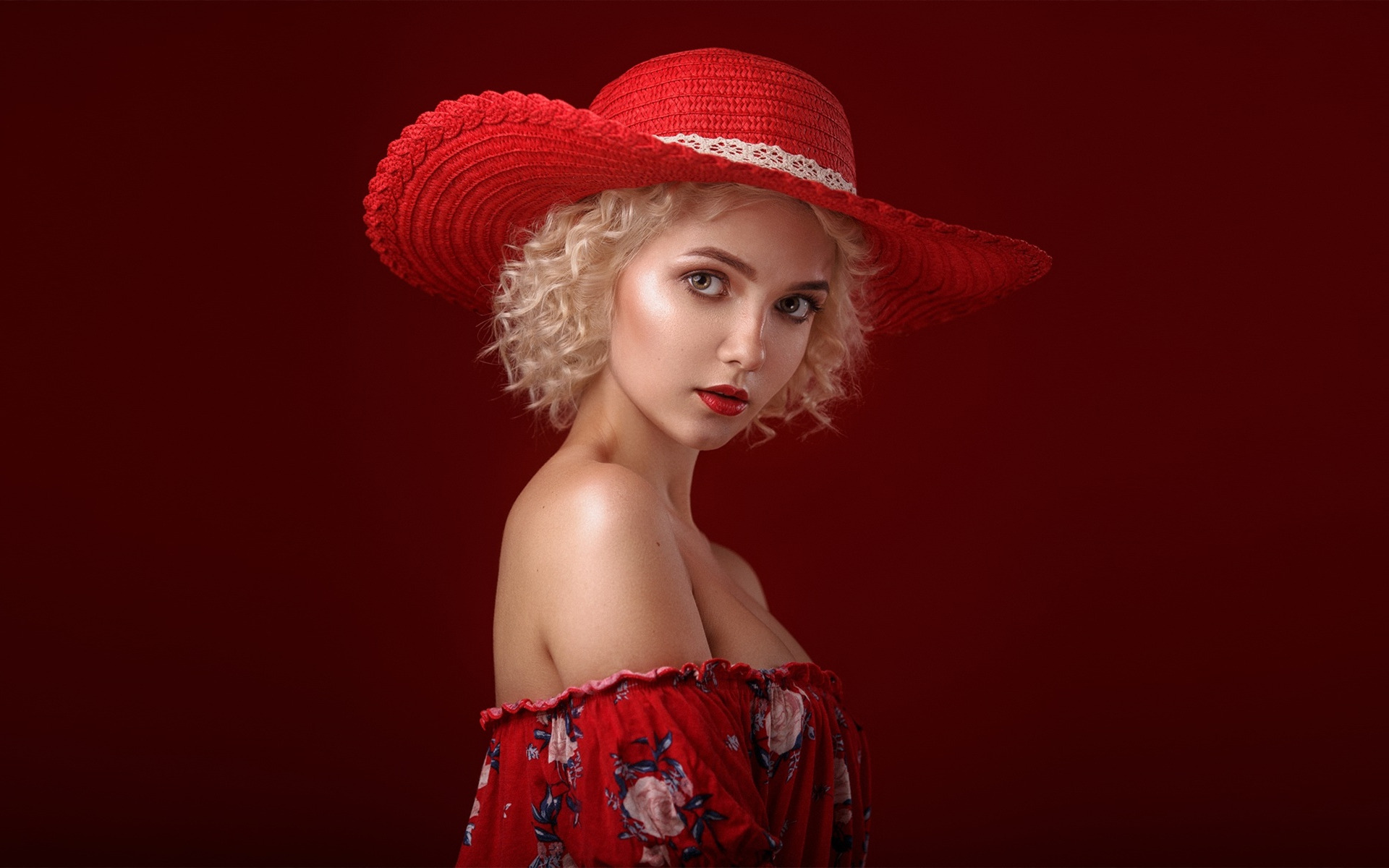 Description: A woman wearing a red hat with a red background and a red background behind her is a red background.