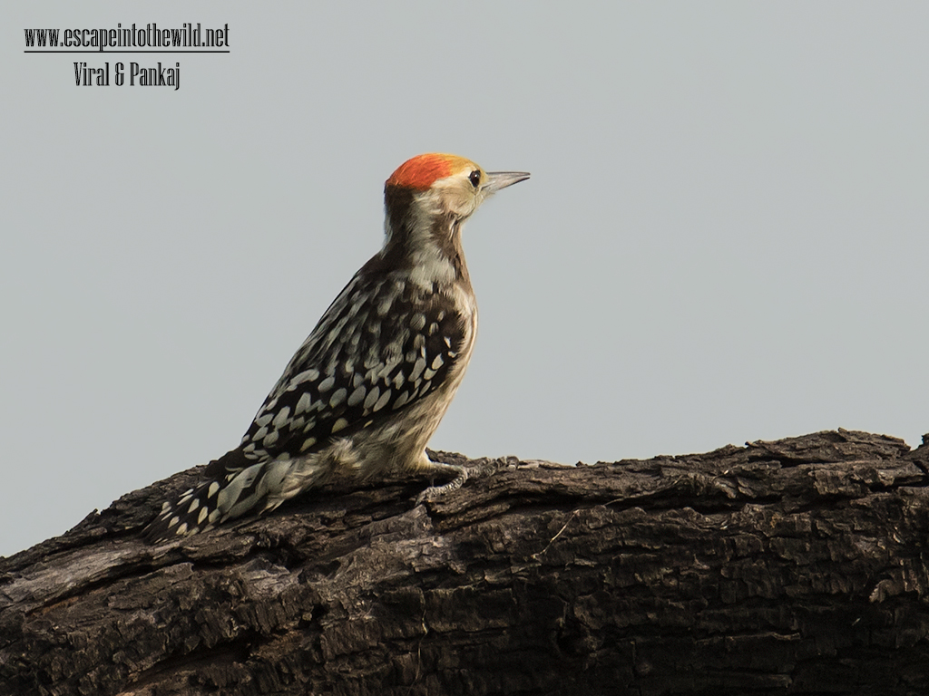 Description: A bird with a red head sitting on a tree branch with a sky background and a gray sky in the background.