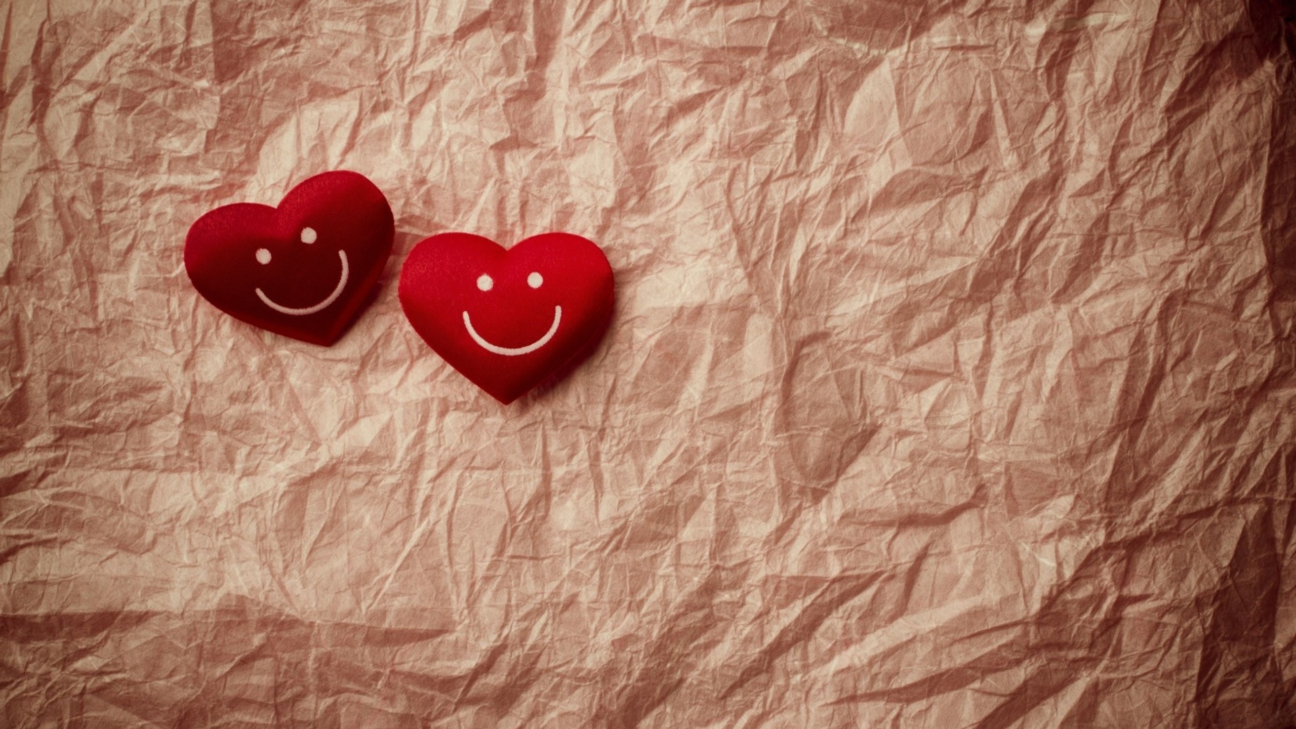 Description: Two red hearts with faces drawn on them on a sheet of paper with a red background with a white stripe.