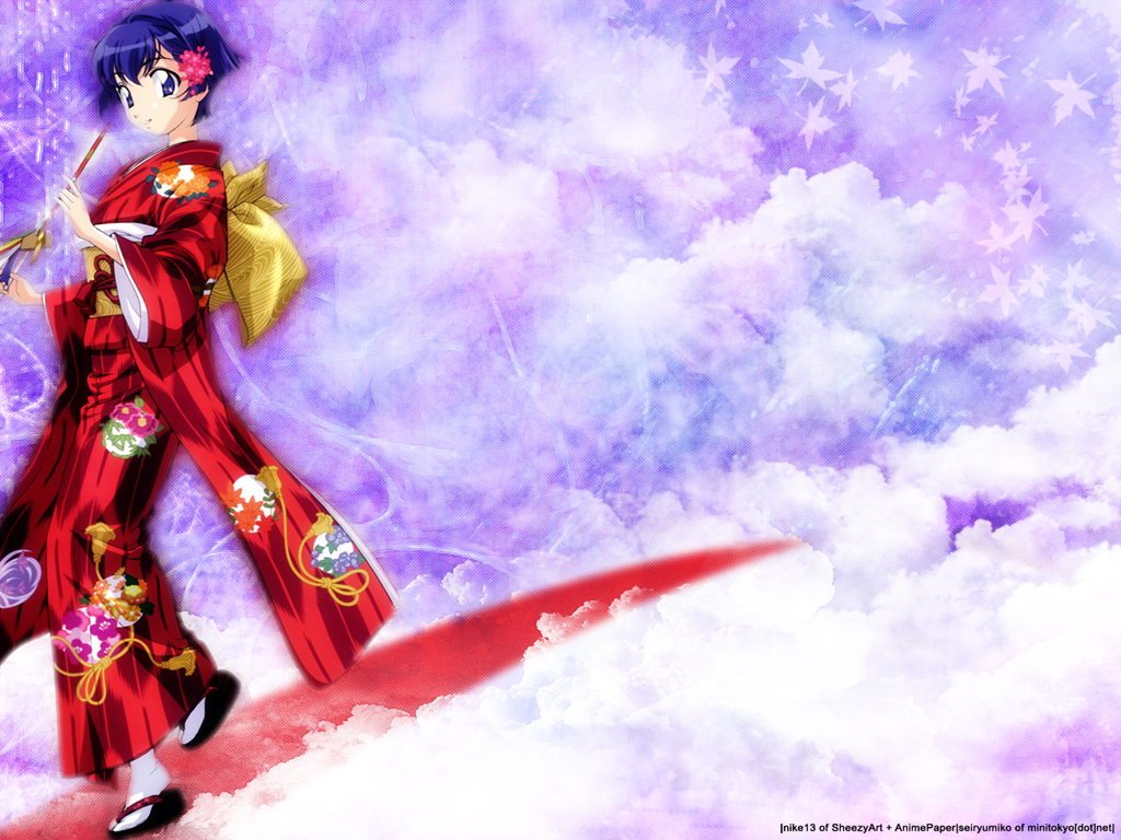 Description: A woman in a red and gold kimono walking on a red carpet with a purple background and white clouds.
