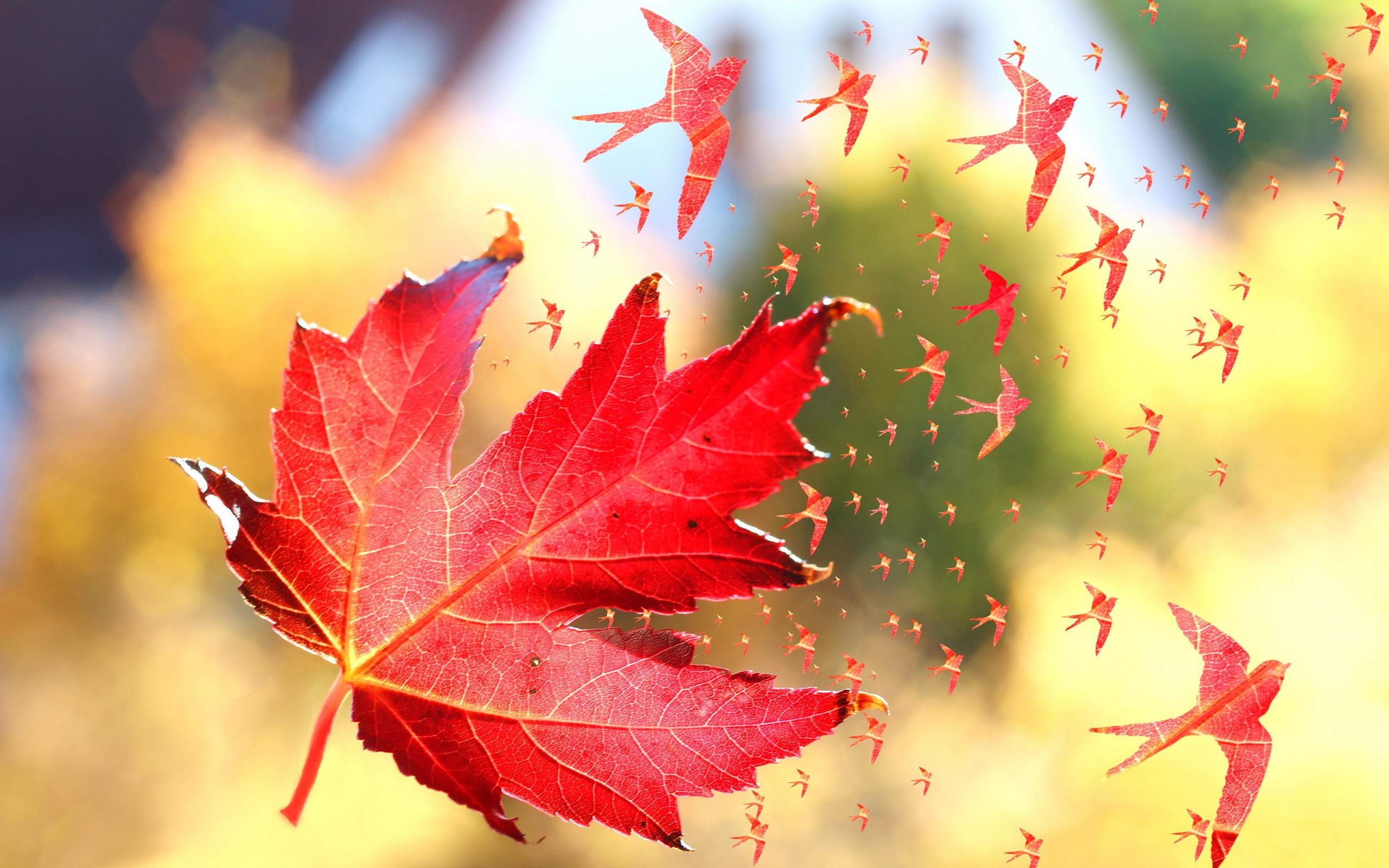 Description: A red leaf with tiny birds flying around it in the air above it.