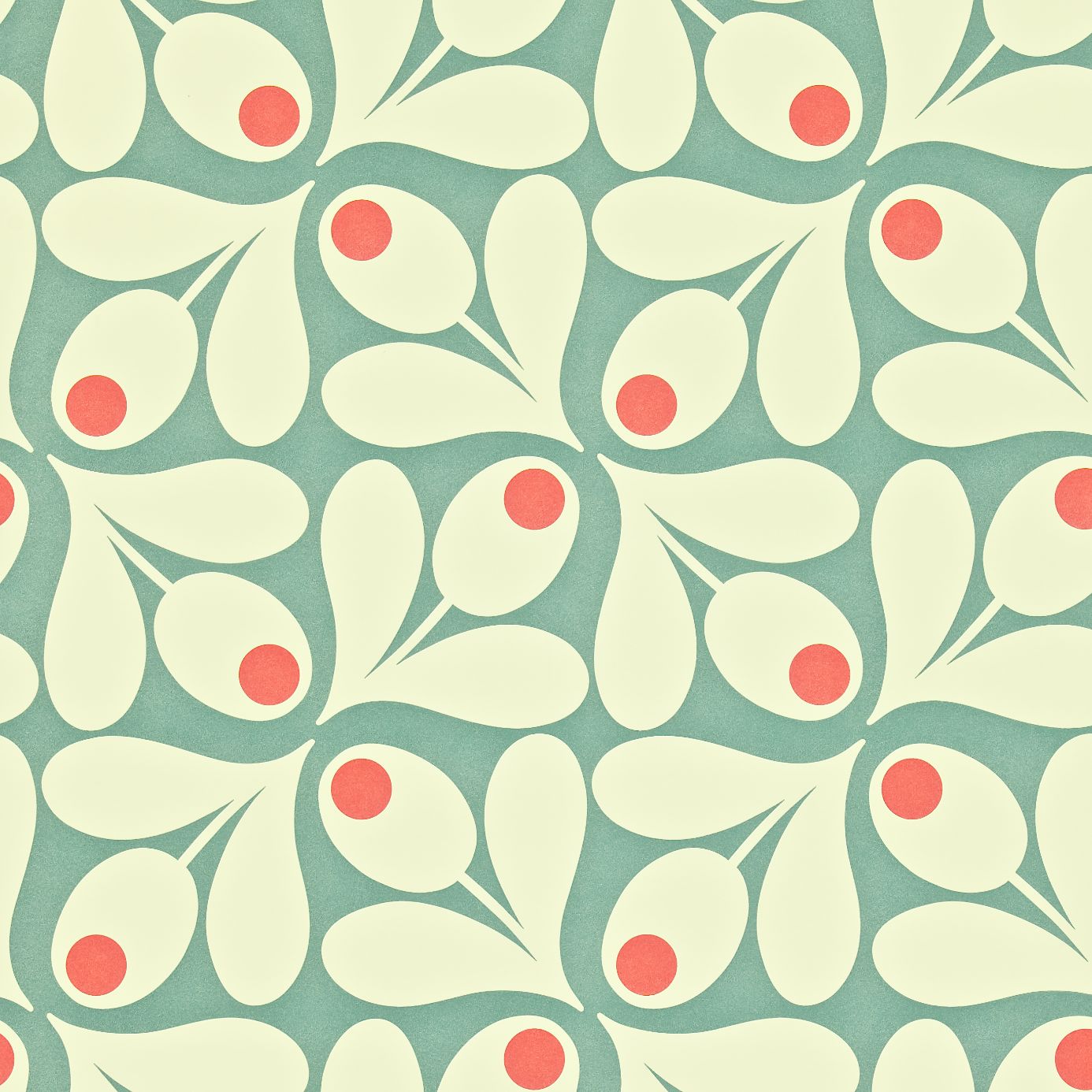 Description: A pattern of leaves and berries on a blue background with red dots on the leaves and the leaves are red.
