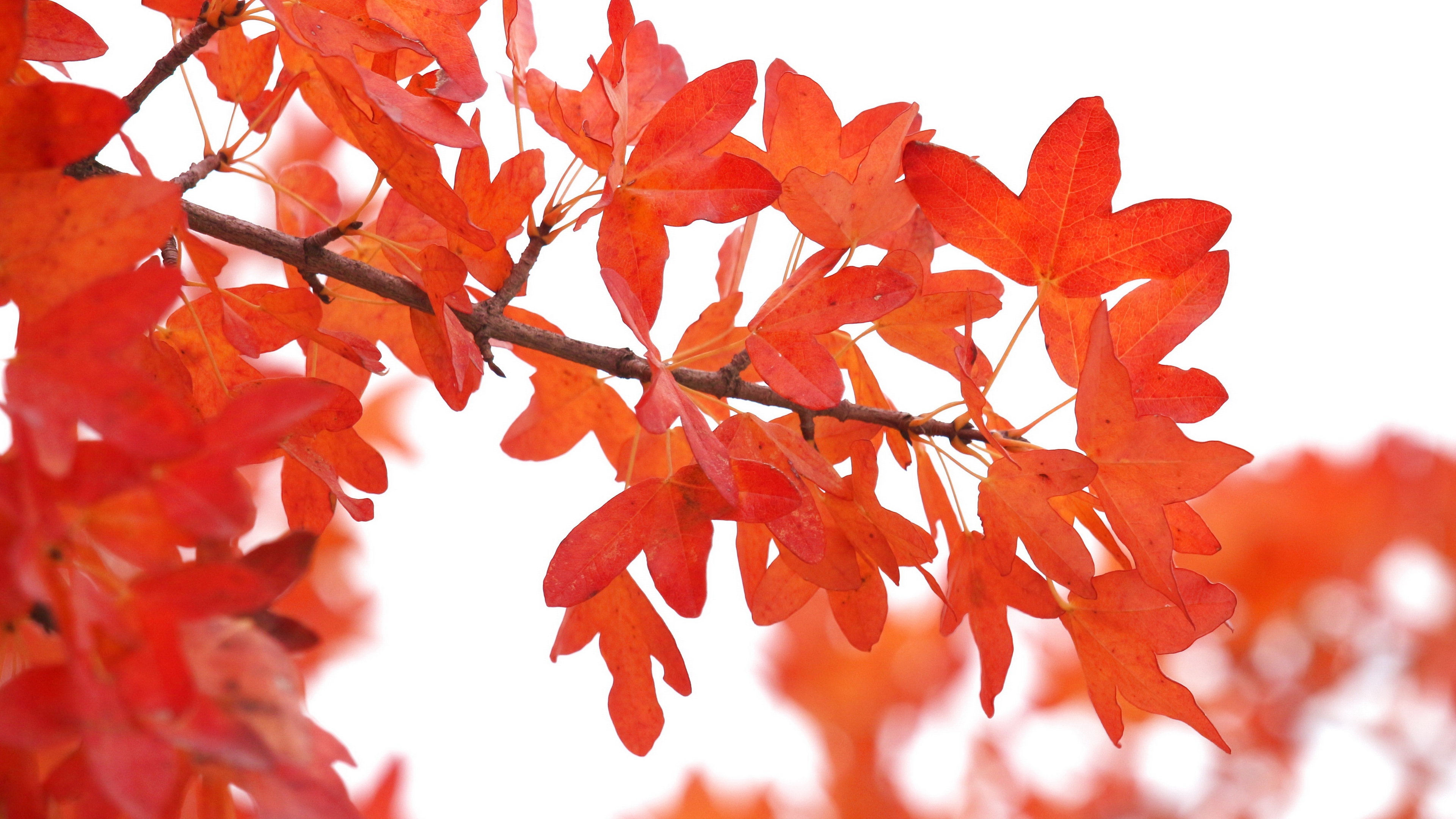 Description: A branch with red leaves on it against a white background with a blurry sky in the background.