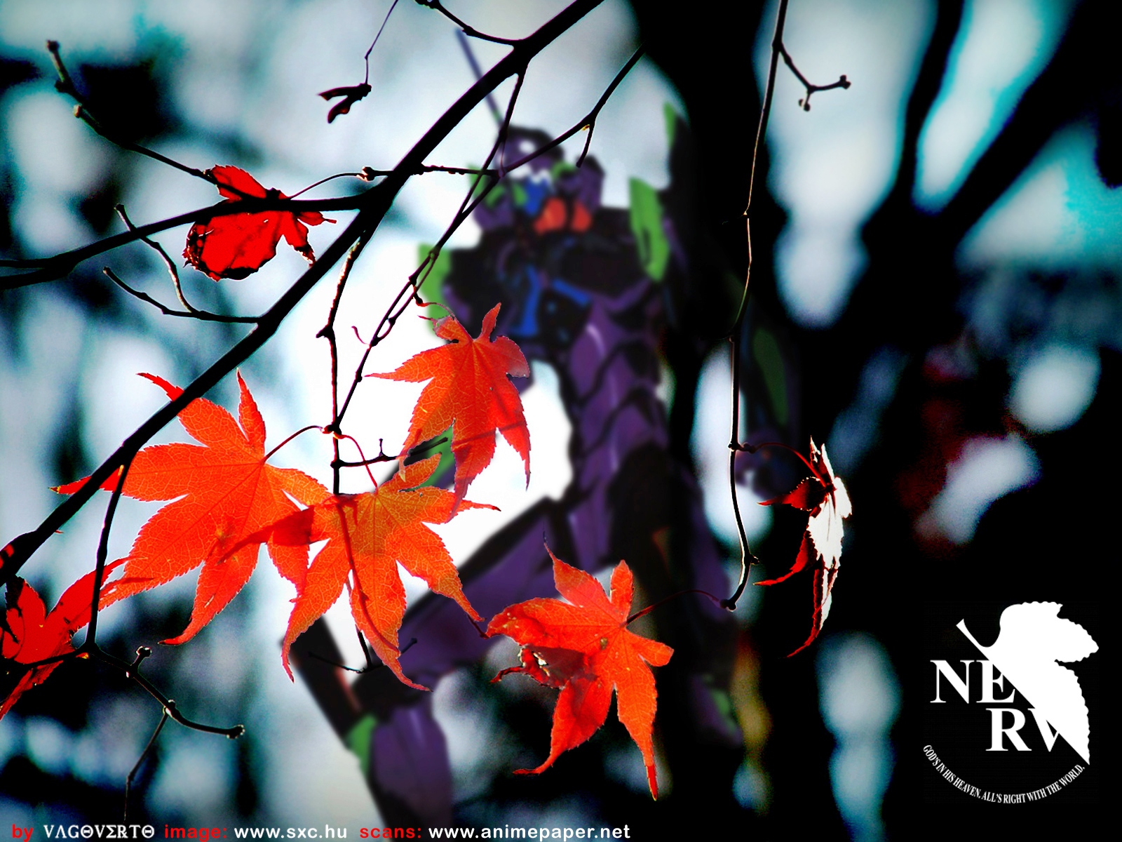 Description: A tree with red leaves and a purple dragon statue in the background with a blue sky in the background.