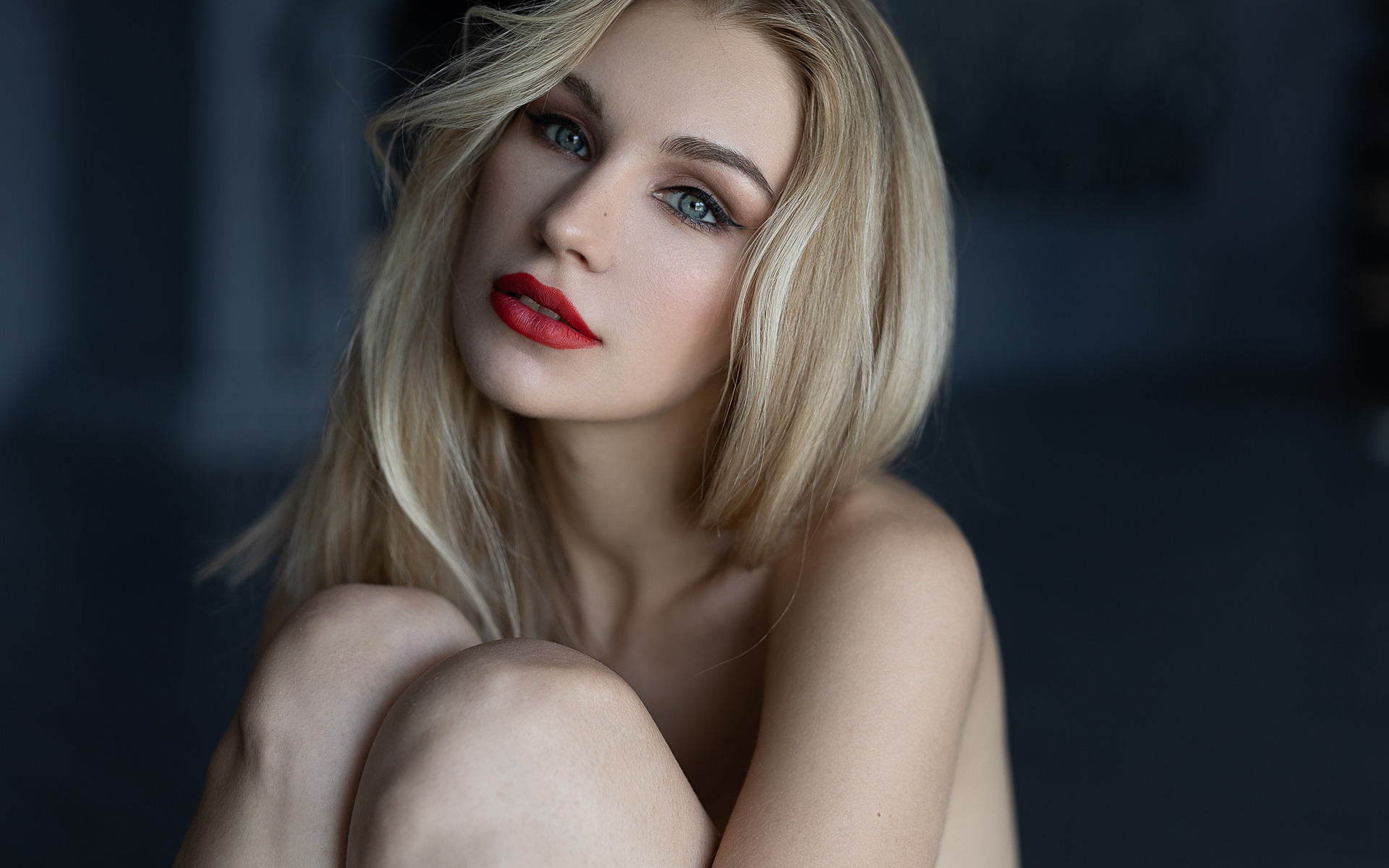 Description: A woman with red lipstick sitting on the floor with her legs crossed and her legs crossed.