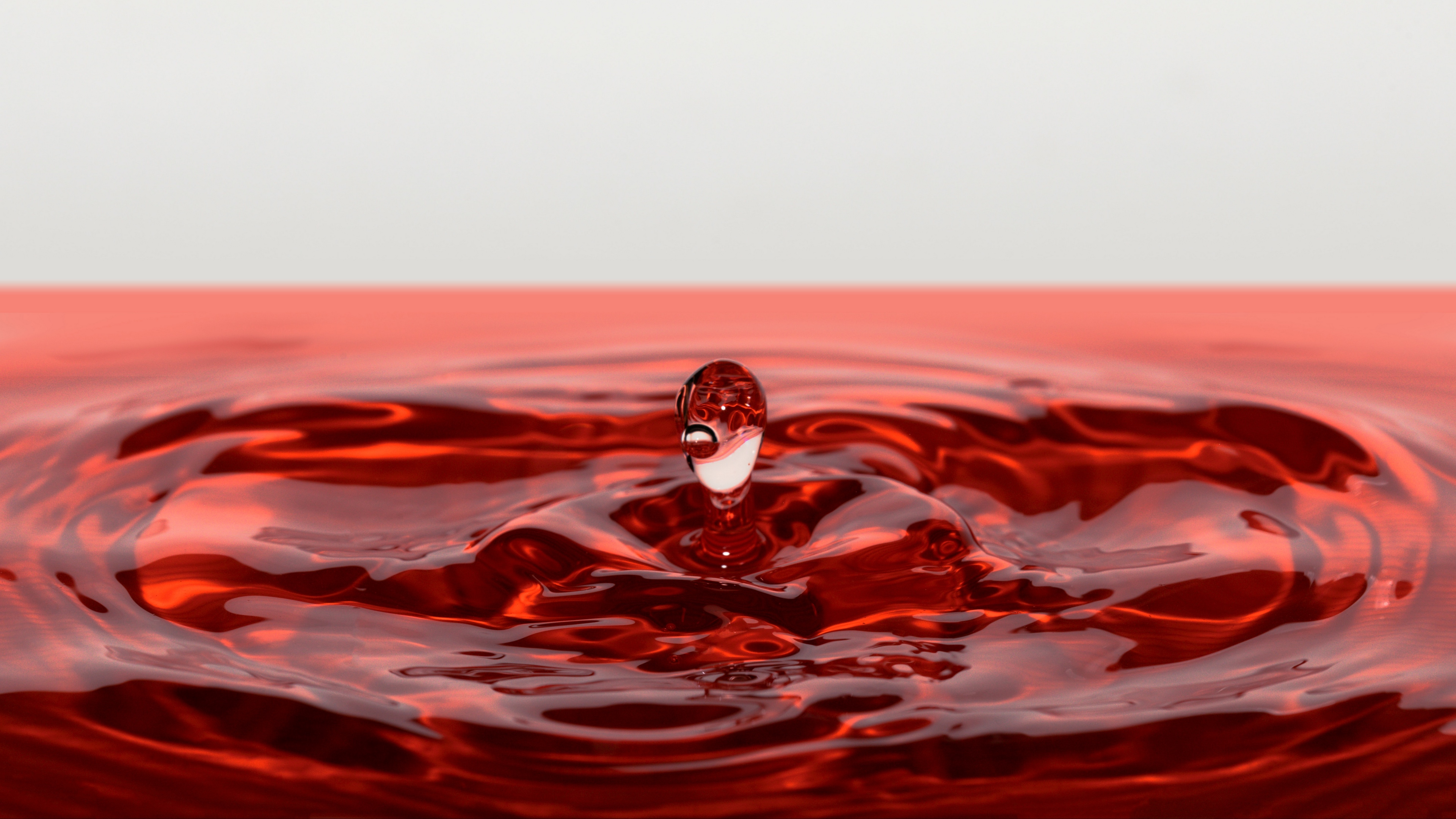 Description: A red liquid droplet with a white background and a white wall in the background.
