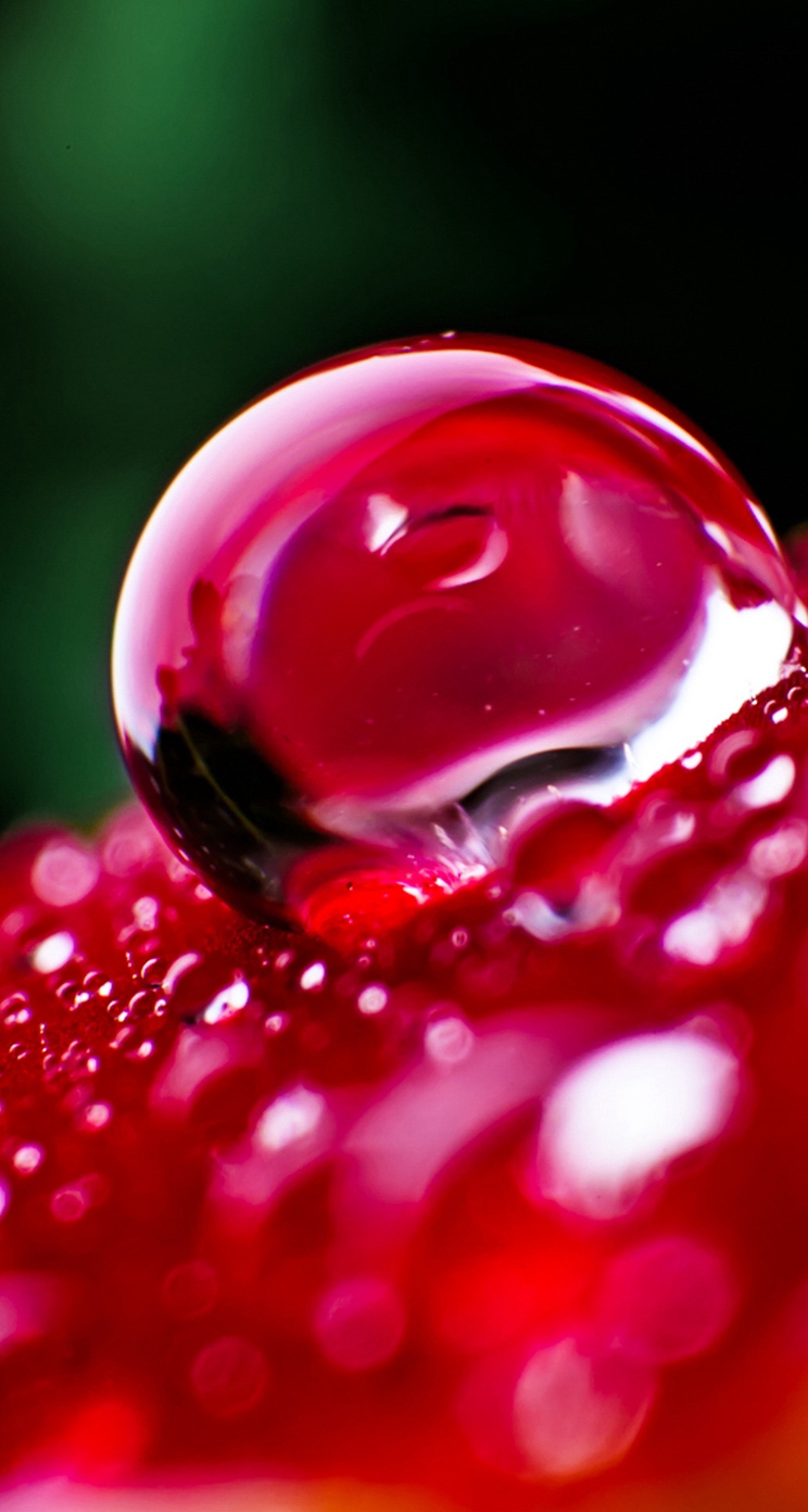 Description: A close up of a red liquid droplet on a flower stem with a green background and a black background.