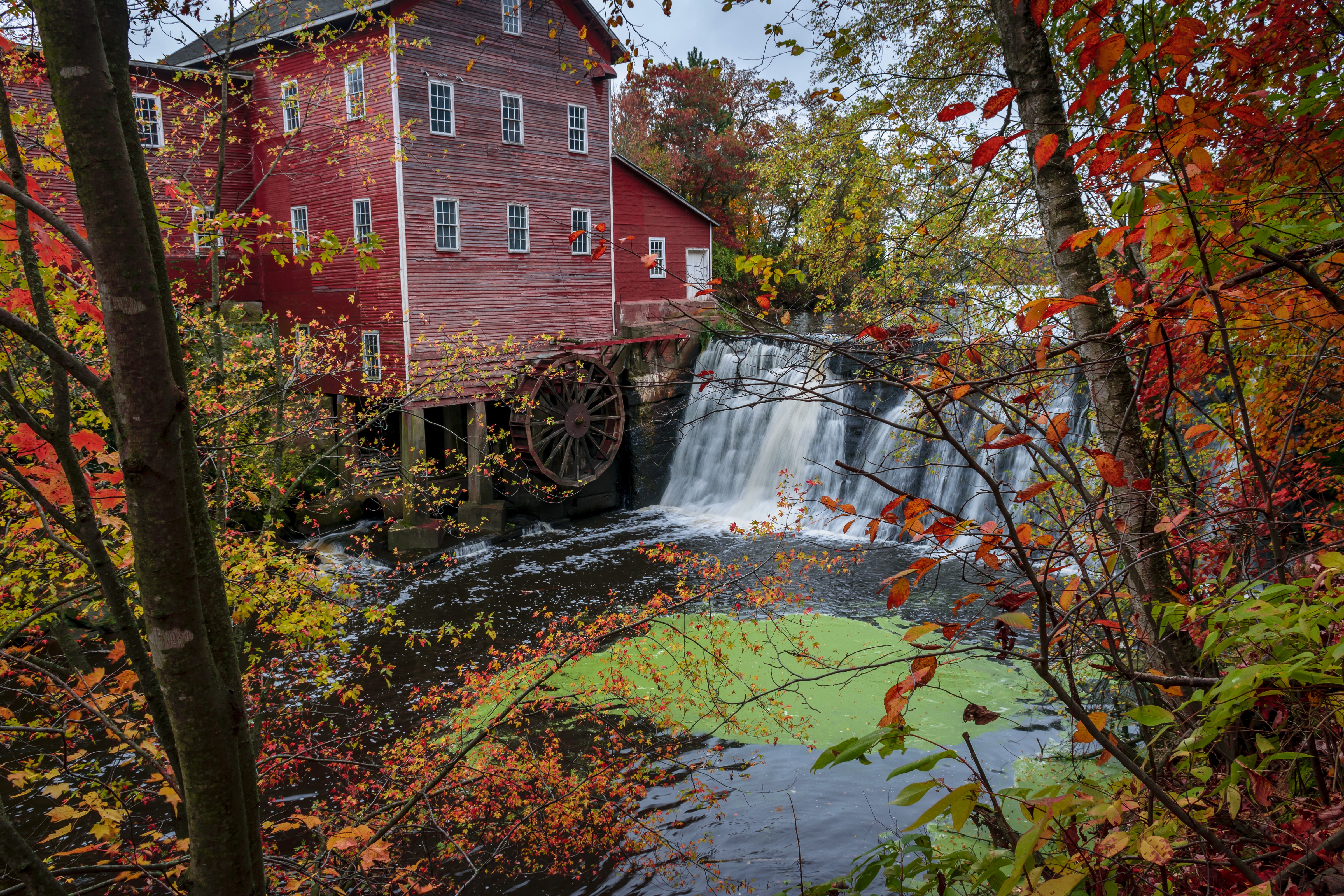 Description: A red mill with a waterfall in the middle of it and trees around it with leaves on the ground.
