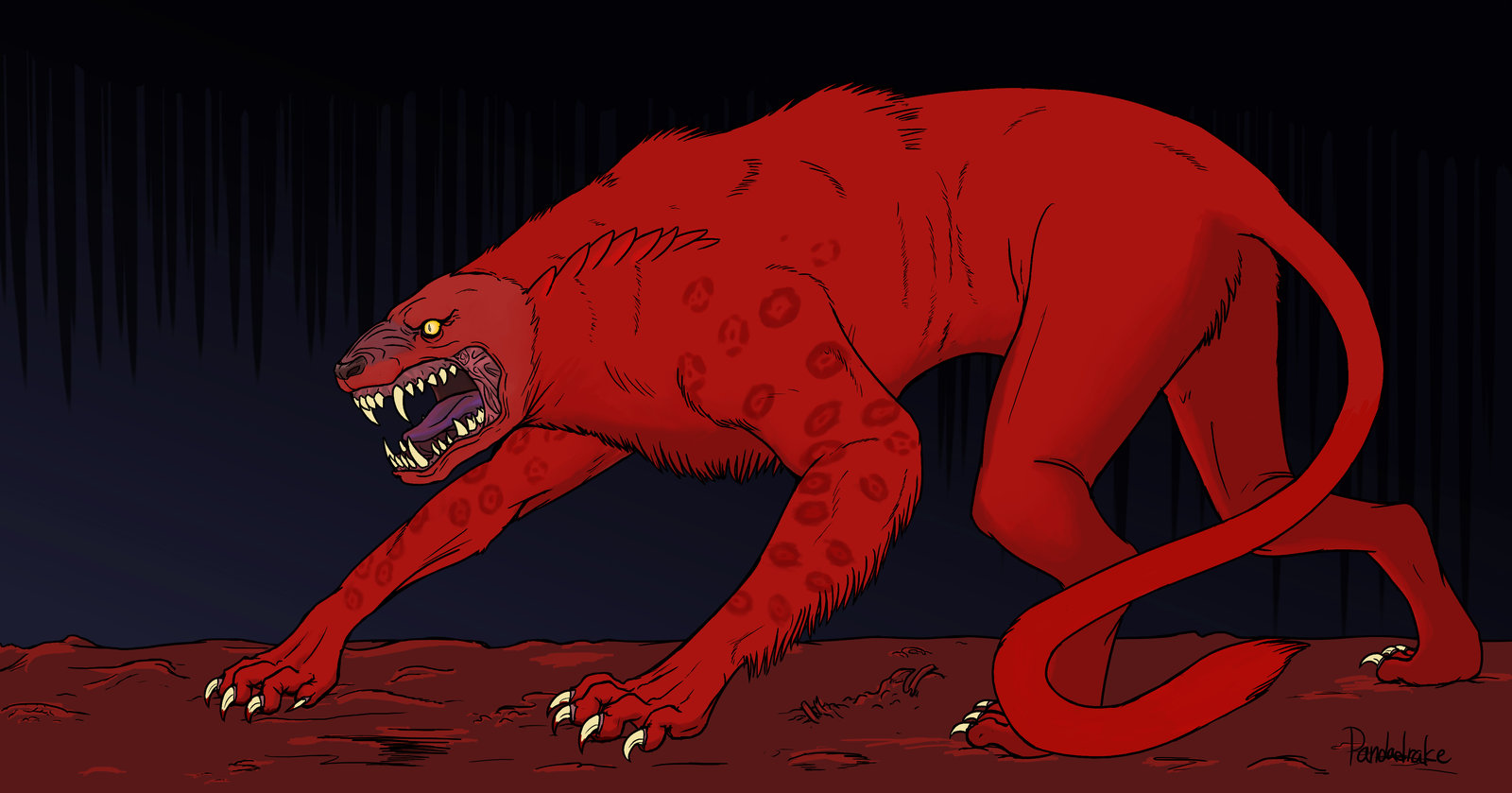 Description: A red monster with sharp teeth and sharp teeth is standing on the ground in the dark with a black background.