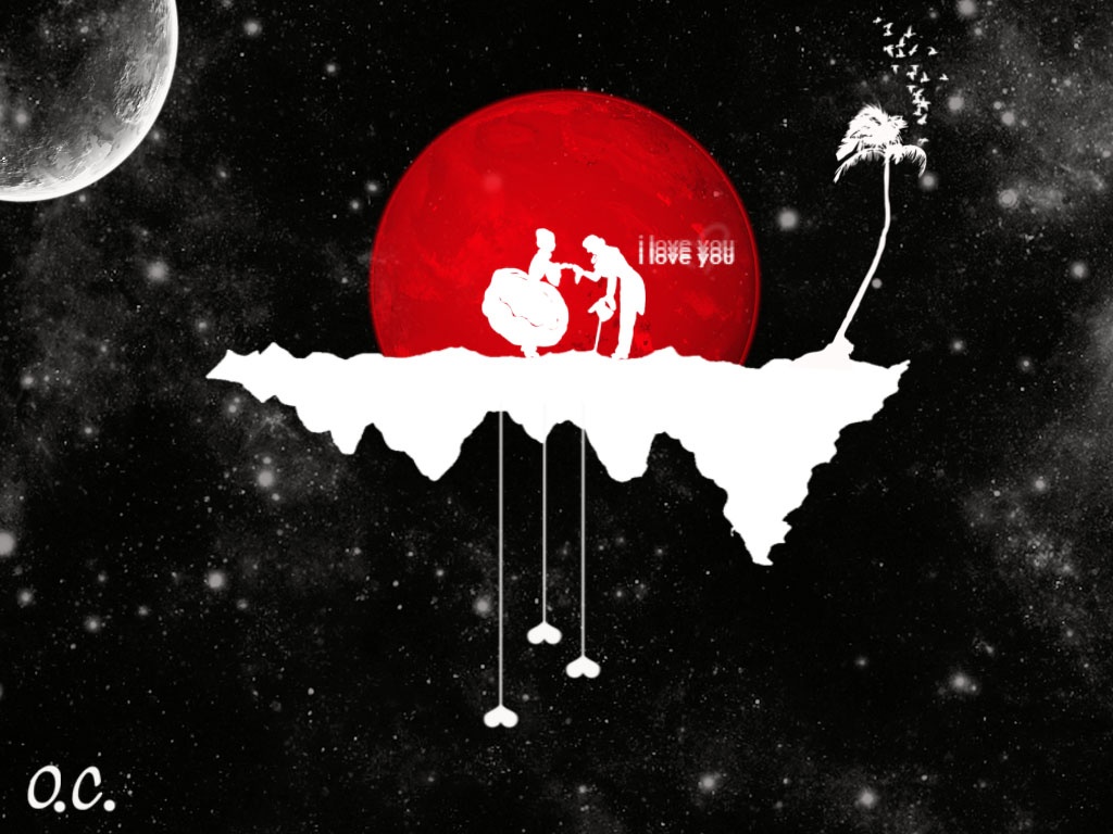 Description: A red moon with a man and a woman on it and a man on a mountain with a tree.