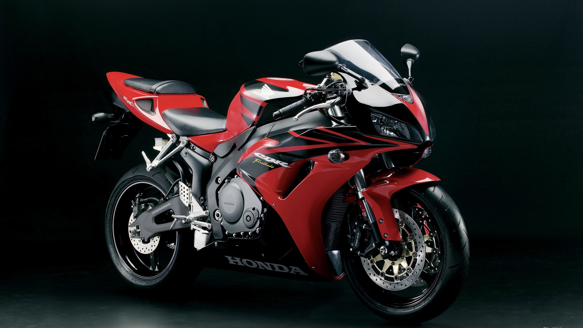 Description: A red motorcycle is parked in a dark room with a black background and a black background behind it is a black background.