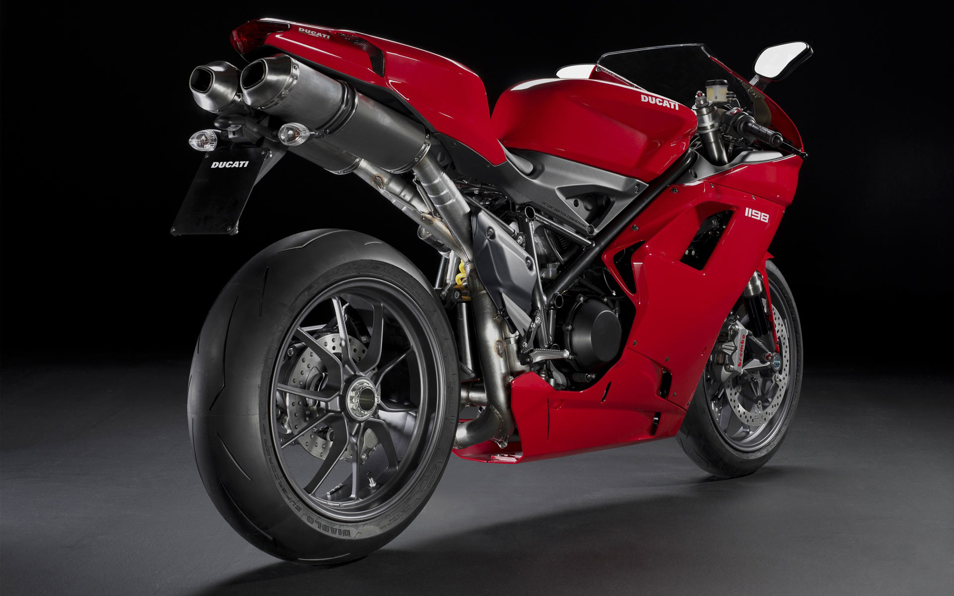 Description: A red motorcycle is shown in a dark room with a black background and a black background behind it is a black background.