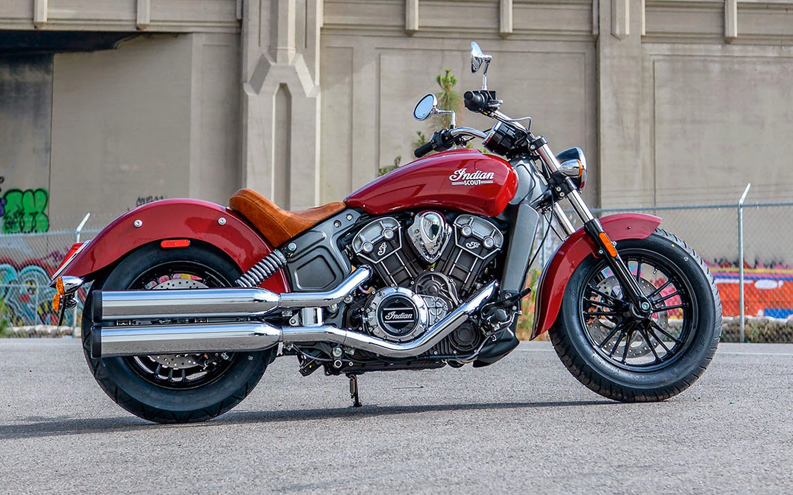 Description: A red motorcycle parked in front of a building with graffiti on it's walls and a fence around it.