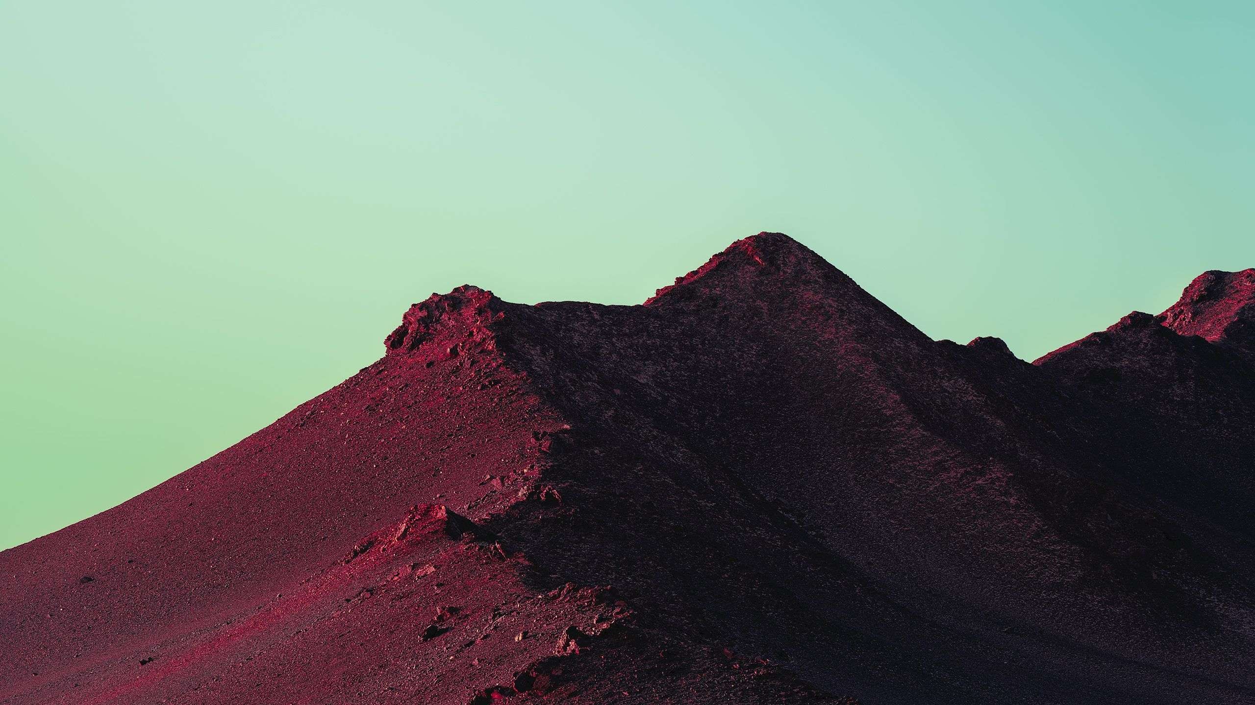 Description: A mountain with a green sky in the background and a red mountain in the foreground with a green sky.