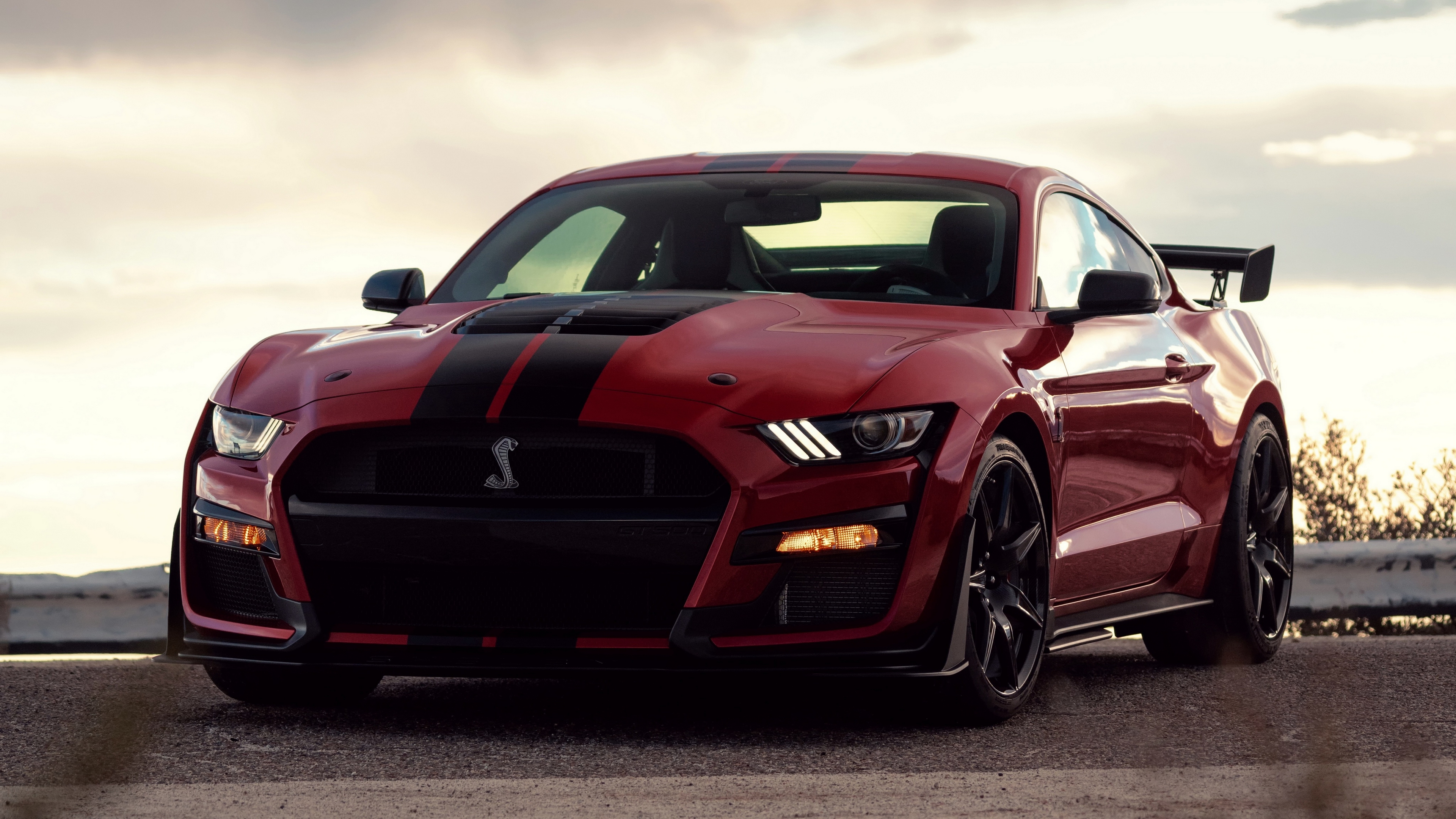 Description: A red mustang mustang with black stripes parked on a road near a fence and trees in the background with a cloudy sky.