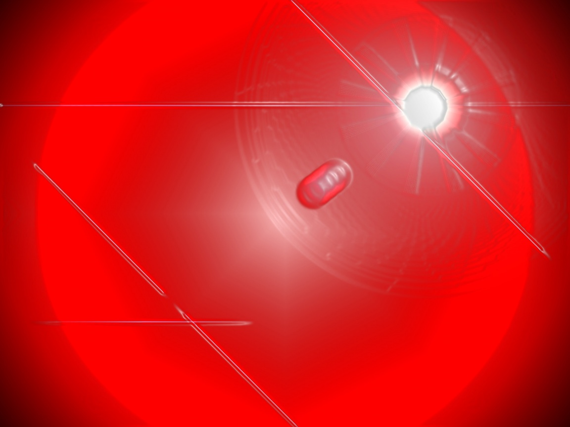 Description: A red object with a white light in the middle of it and a black background with lines around it.
