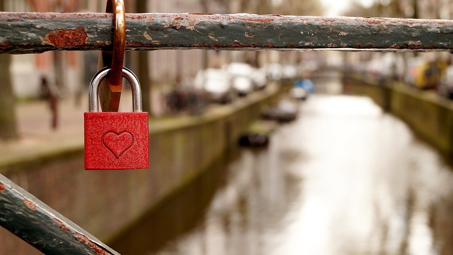 Description: A red padlock attached to a wooden fence near a canal with cars on it and a heart shaped padlock.