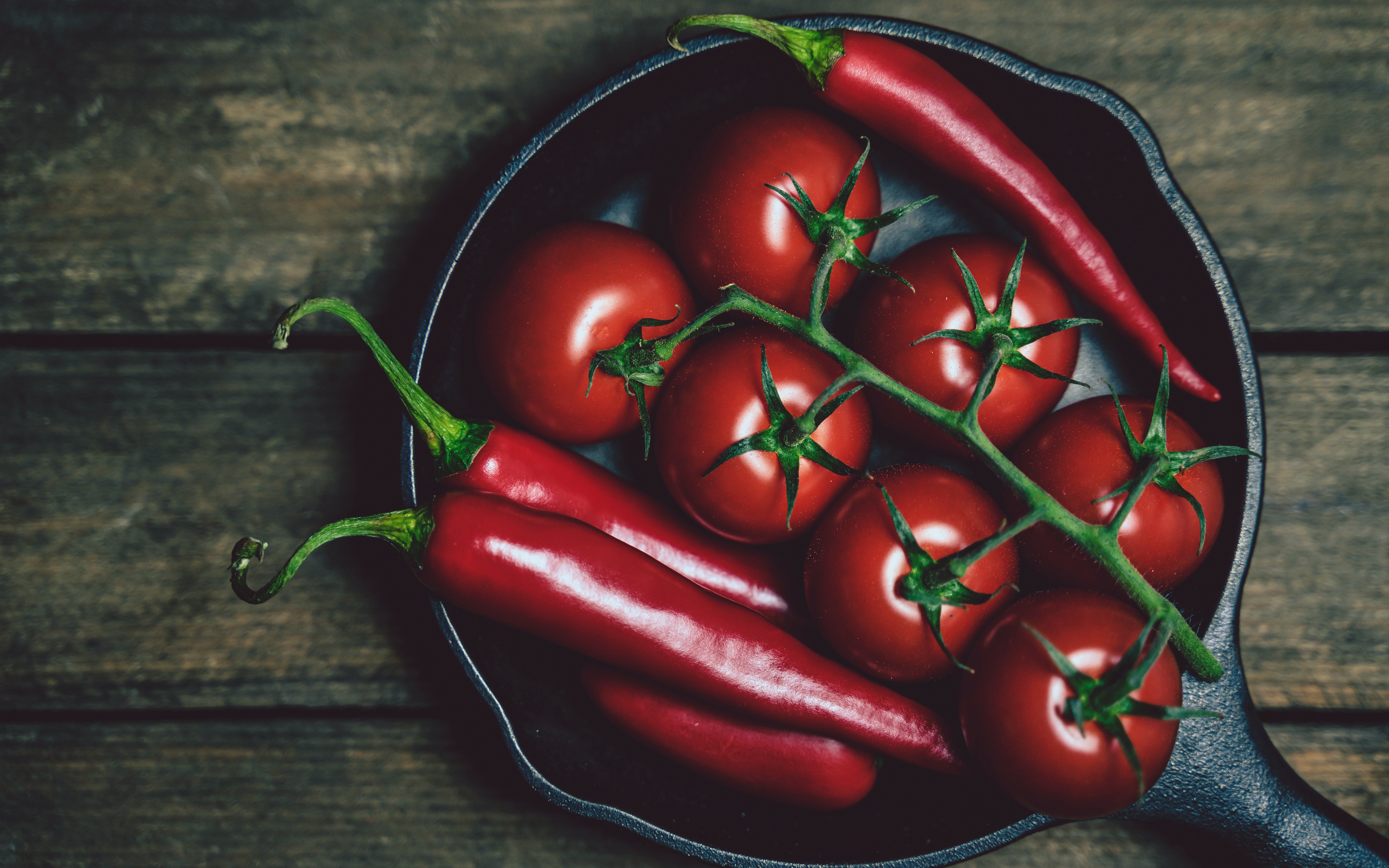 Description: A pan filled with red peppers on top of a wooden table next to a knife and fork and a spoon.