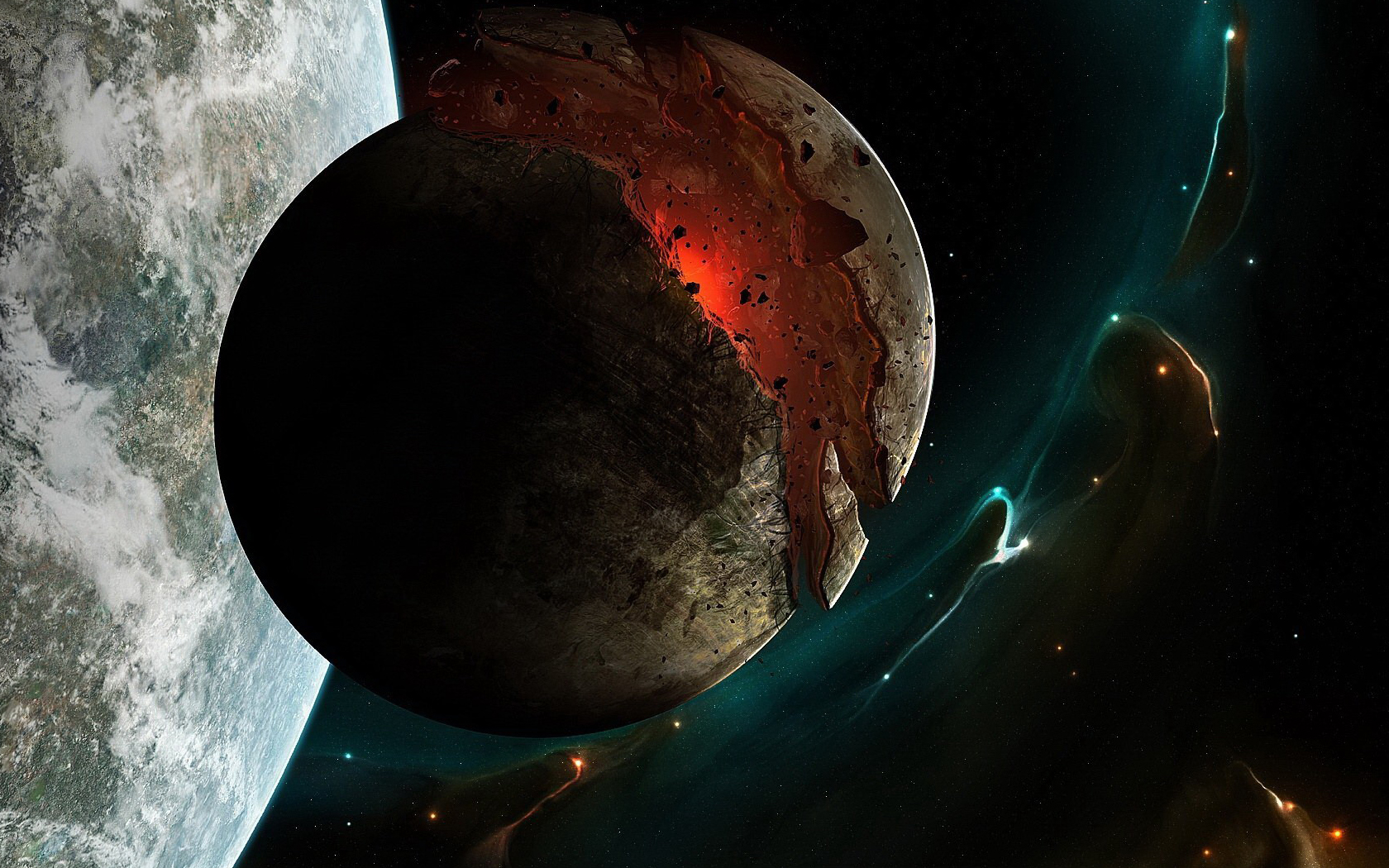 Description: A planet with a red light on it and a blue moon in the background with stars around it and a bright light on the side of the planet.
