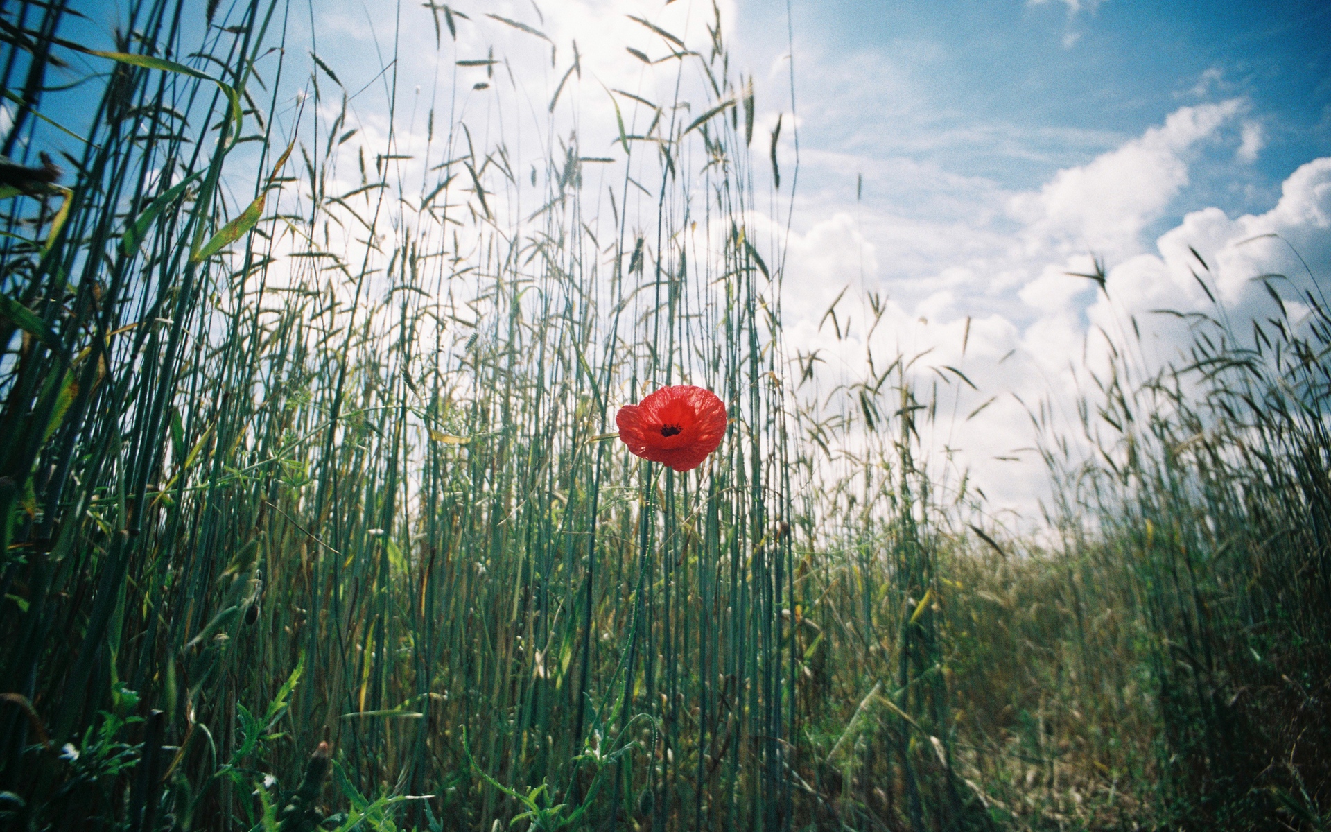 Description: A red poppy in a field of tall grass with a blue sky in the background with clouds in the sky.