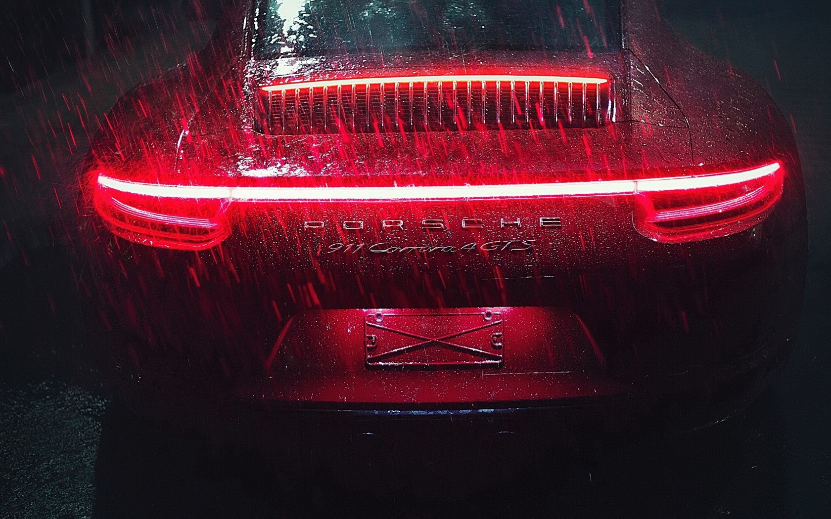Description: A red porsche car is shown in the rain with its tail lights on and the word porsche illuminated on.