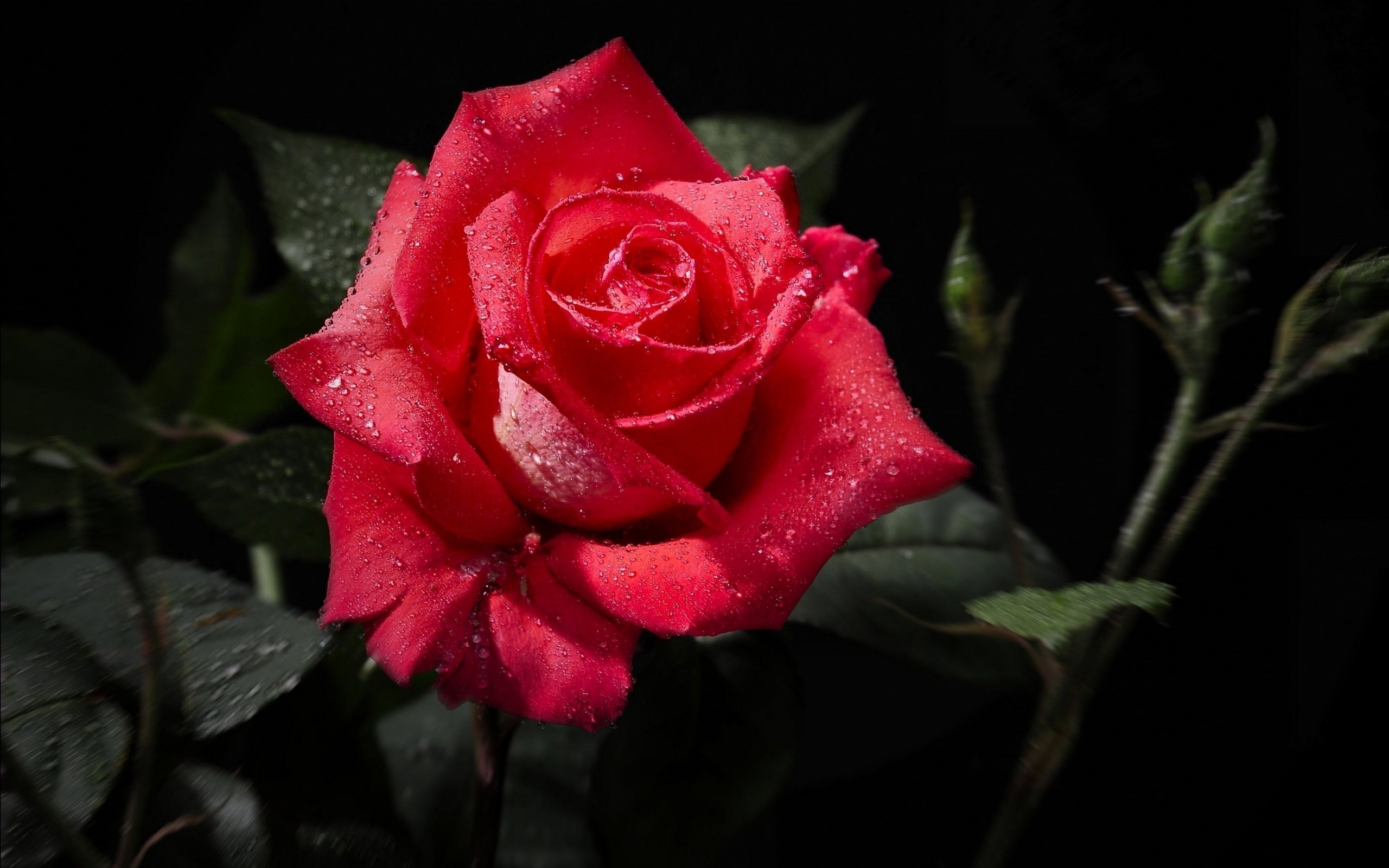 Description: A red rose with water droplets on it's petals and leaves in the dark background.