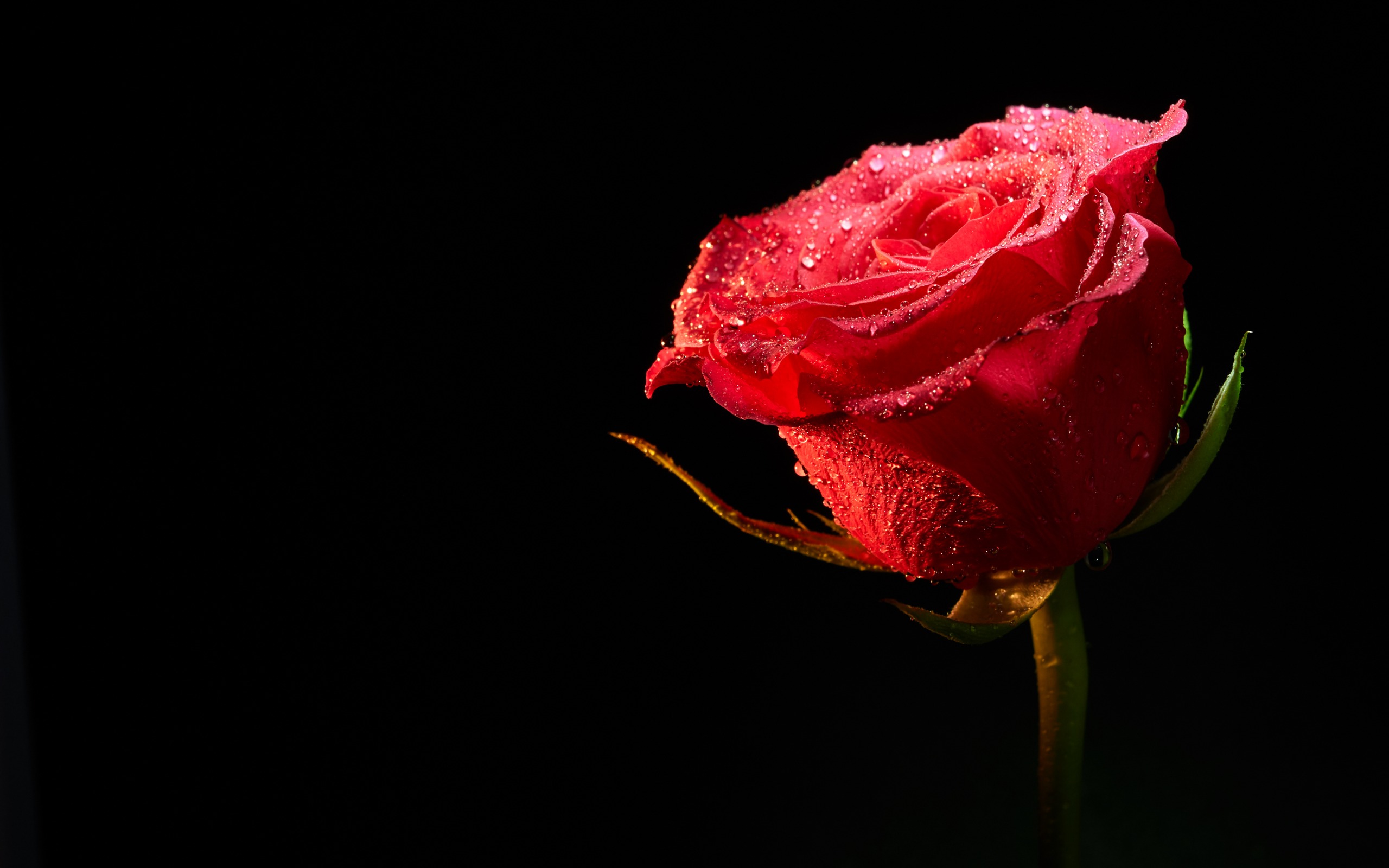 Description: A single red rose with water droplets on it's petals and a black background with a black background.