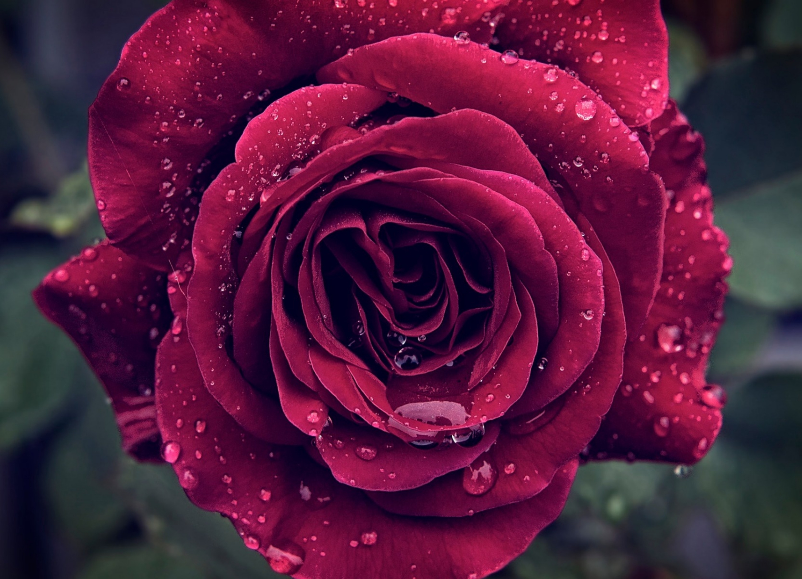 Description: A red rose with water droplets on it's petals and leaves in the background.