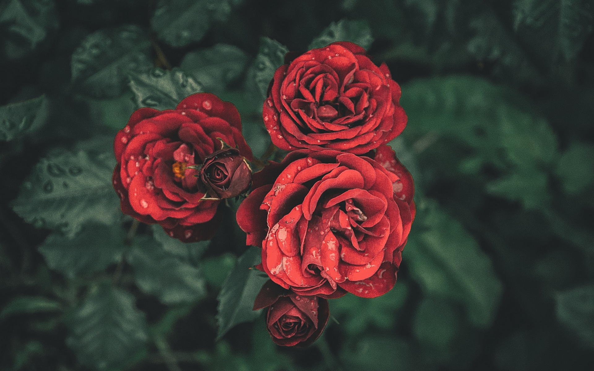 Description: Three red roses with green leaves in the background and a dark background with a few drops of water on them.