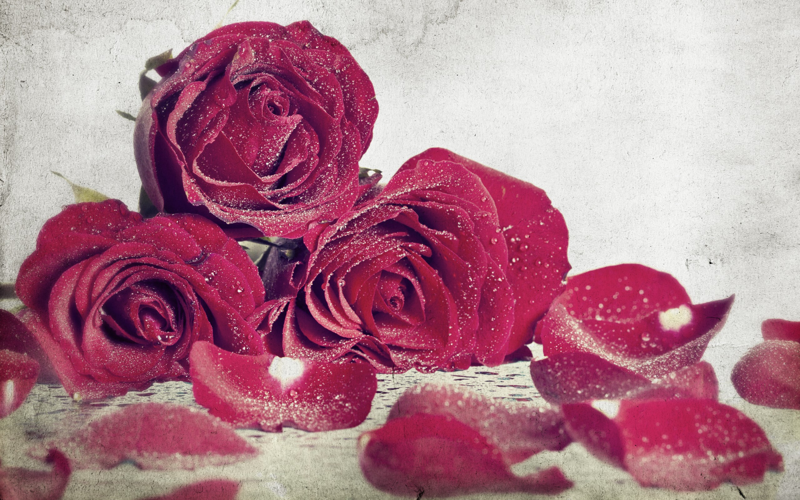 Description: A bunch of red roses with water droplets on them sitting on a table with a white background and a few petals.