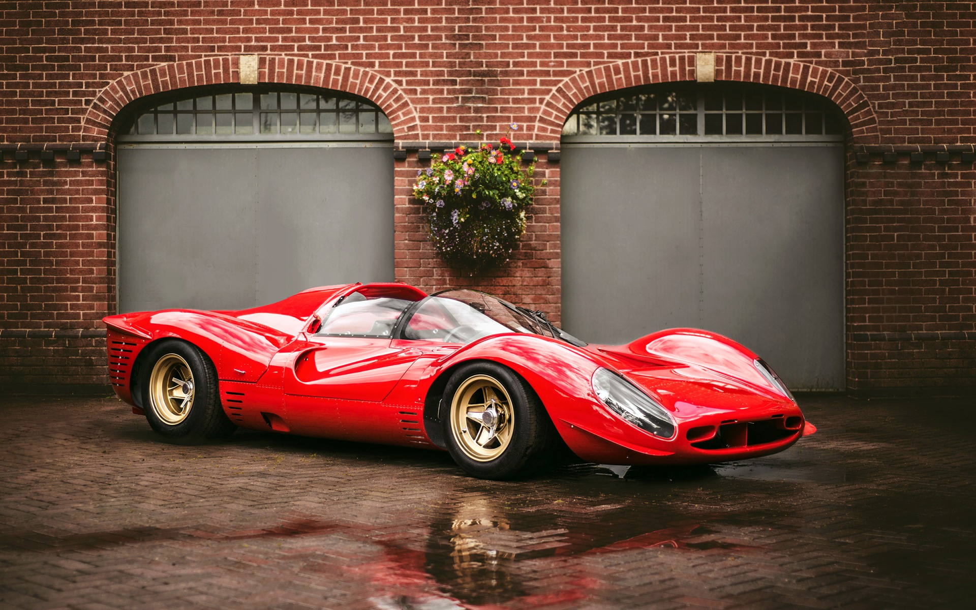 Description: A red sports car parked in front of a brick building with a planter on the side of the building.