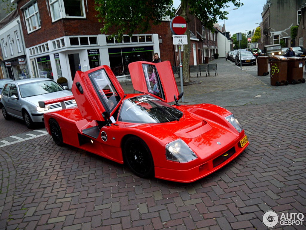 Description: A red sports car parked on a brick road next to a building with open doors on the front of it.