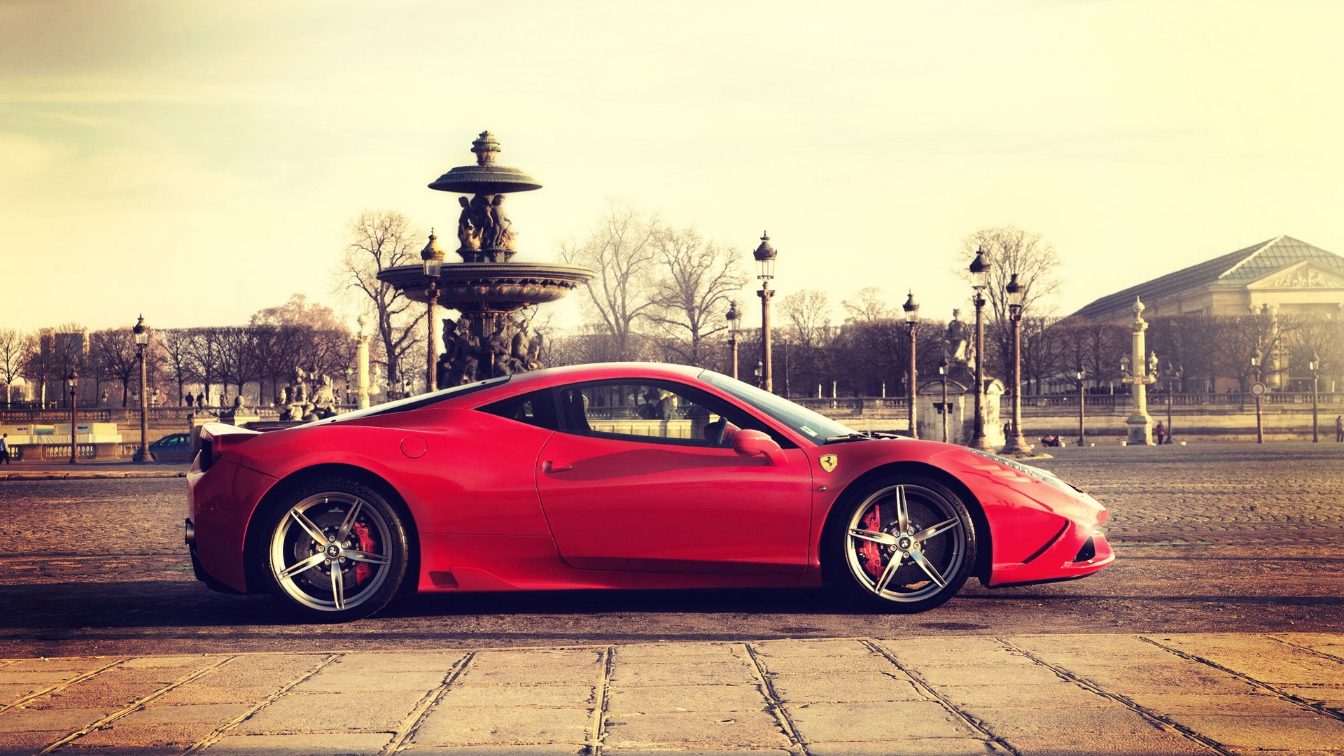 Description: A red sports car parked in front of a fountain in a city square with a fountain in the background.