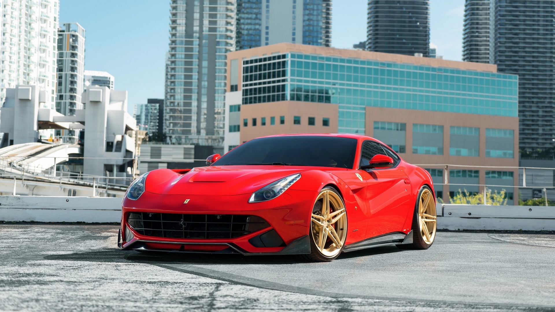 Description: A red sports car parked in front of a city skyline with skyscrapers in the background.