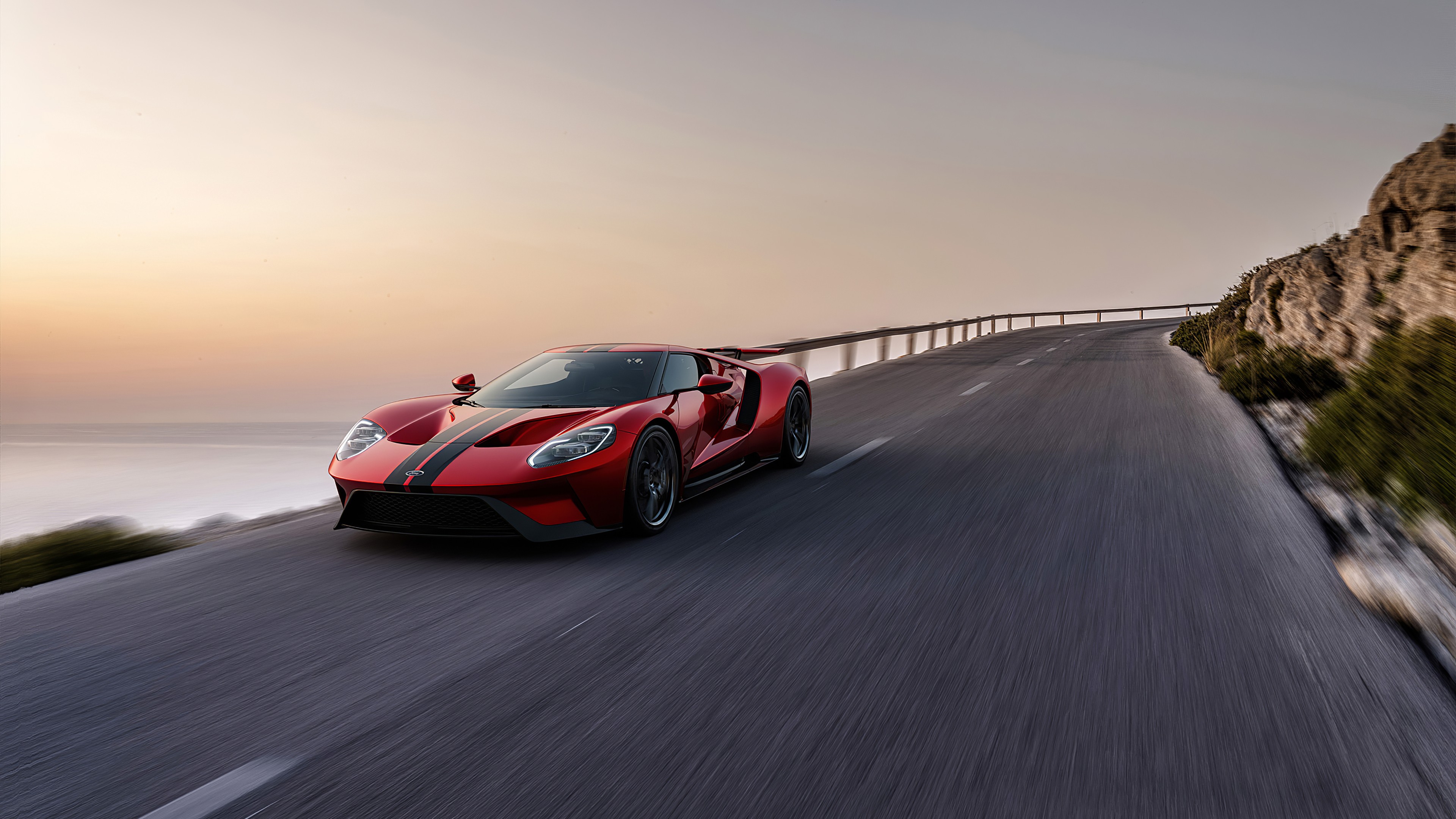 Description: A red sports car driving down a road next to a cliff and ocean at sunset or dawn with a bridge in the background.