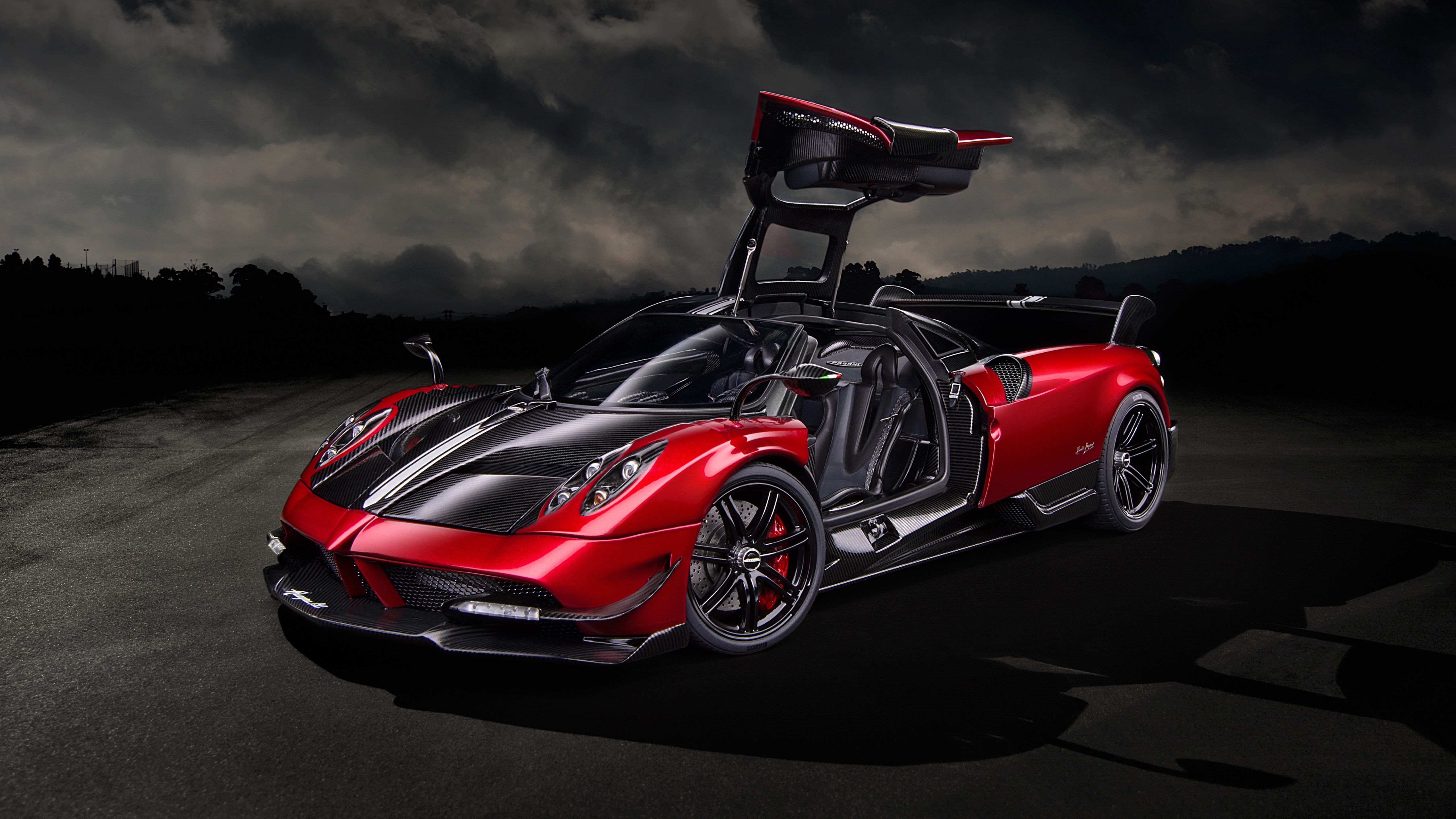 Description: A red sports car parked on a dark road with a dark sky in the background and dark clouds in the sky.