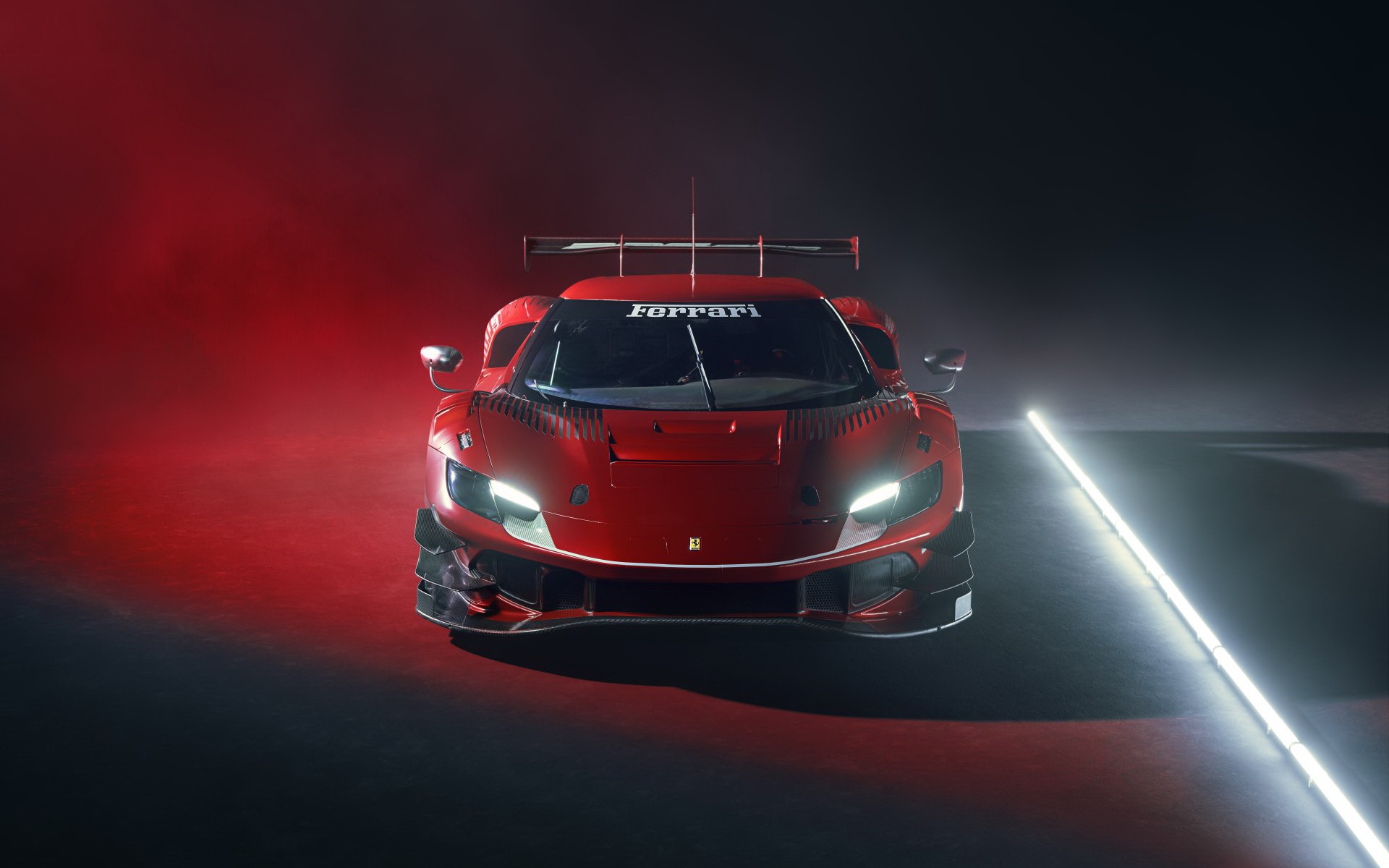 Description: A red sports car driving on a dark road with a red light behind it and a red light behind it.